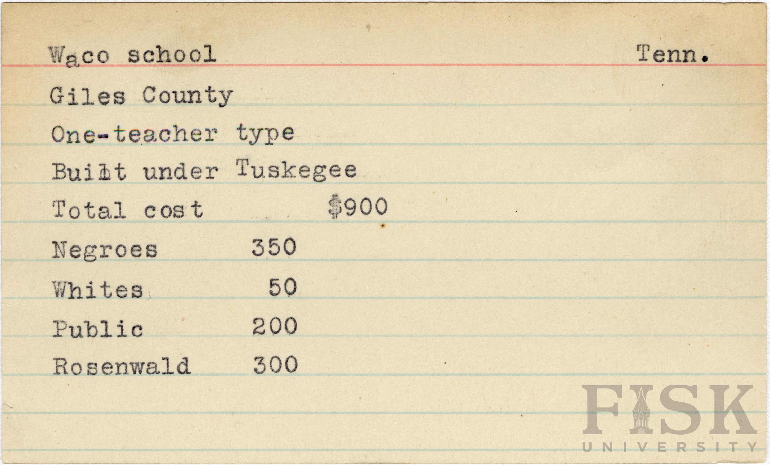 - School card from Rosenwald Fund for Waco School in Giles County, Tennessee