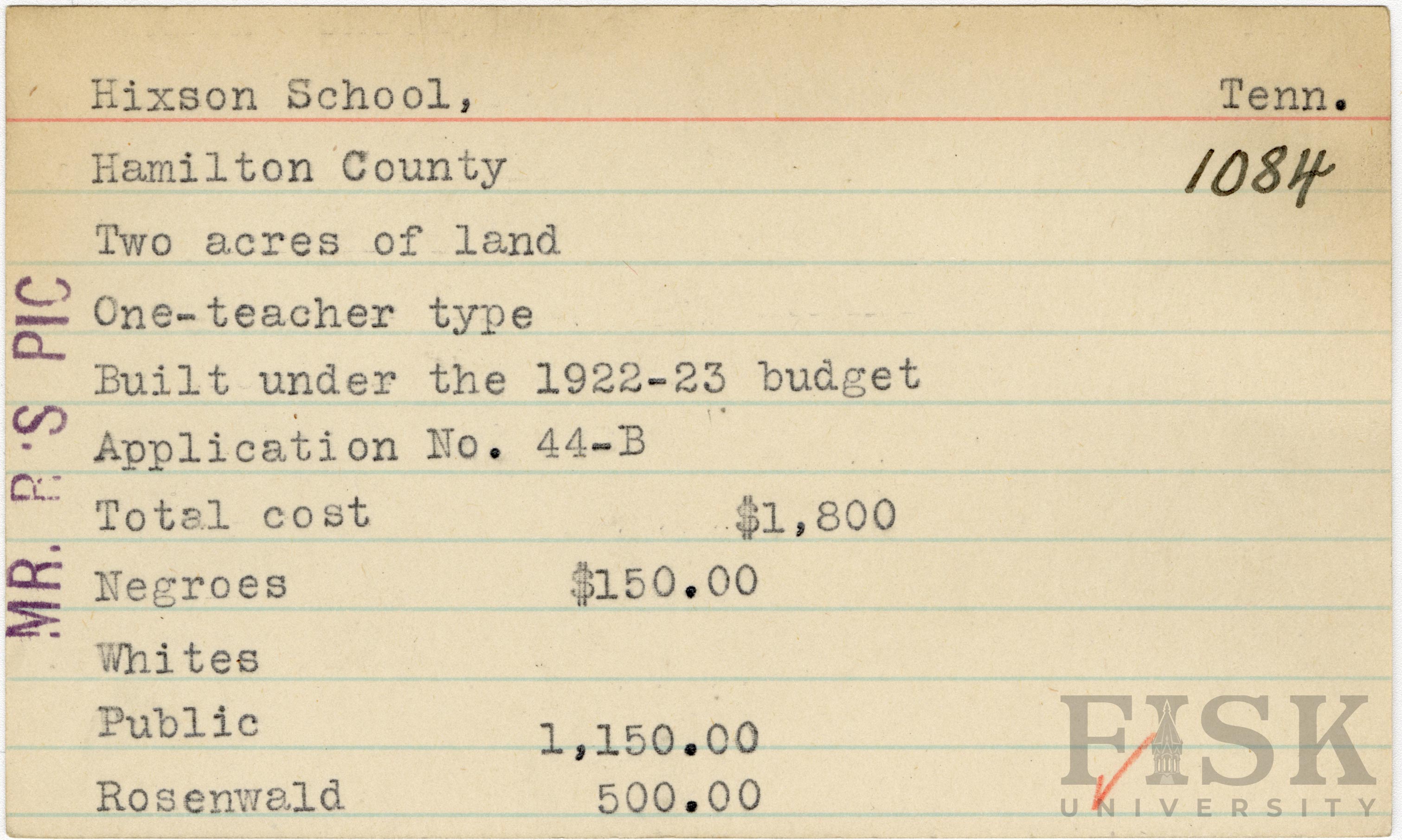 - School card from Rosenwald Fund for Hixson School in Hamilton County, Tennessee with a note on the card that says, "Mr. R's Pic"