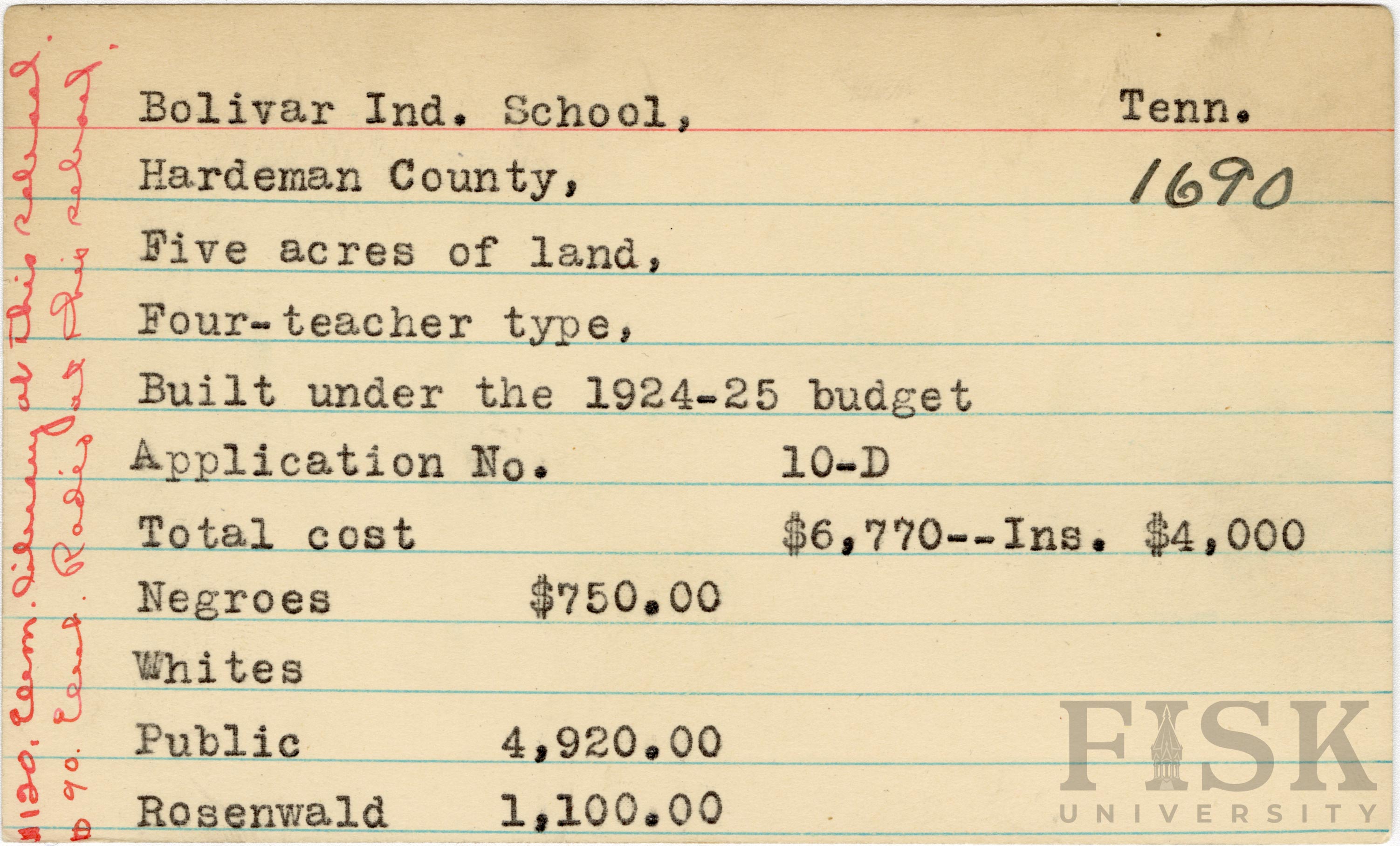 - School card from Rosenwald Fund for Bolivar Industrial School in Hardeman County, Tennessee with a section added to the budget contributions that says, "Ins. $4,000". Notes on the card say, "$120 elem library at this school" and "$90 elec radio at this school"
