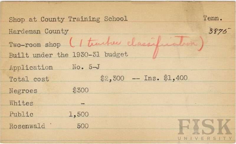 - School card from Rosenwald Fund for the two room shop at County Training School in Hardeman County, Tennessee with a section added to the budget contributions that says, "Ins. $1,400"