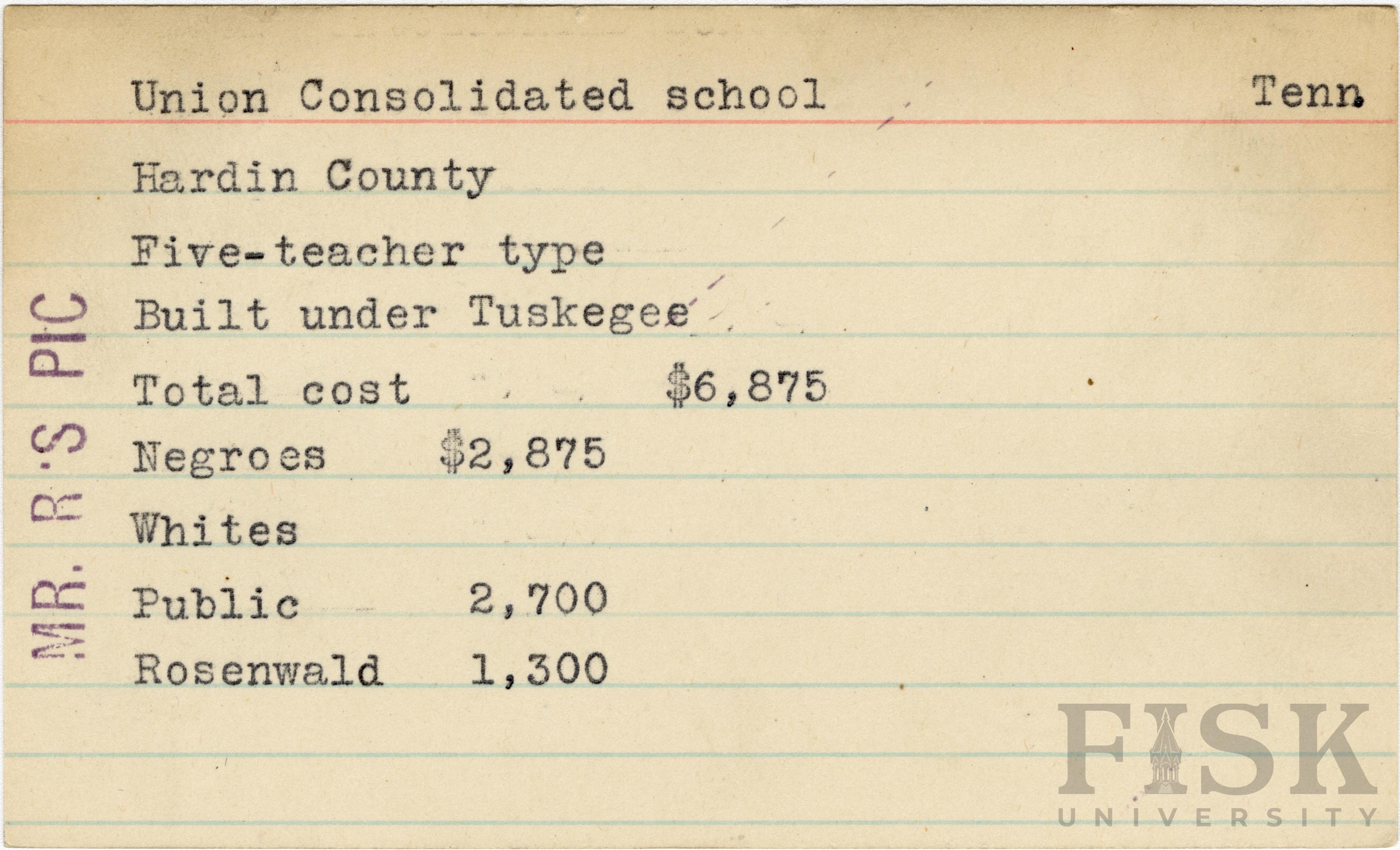 - School card from Rosenwald Fund for Union Consolidated School in Hardin County, Tennessee with a note on the card that says, "Mr. R's Pic"