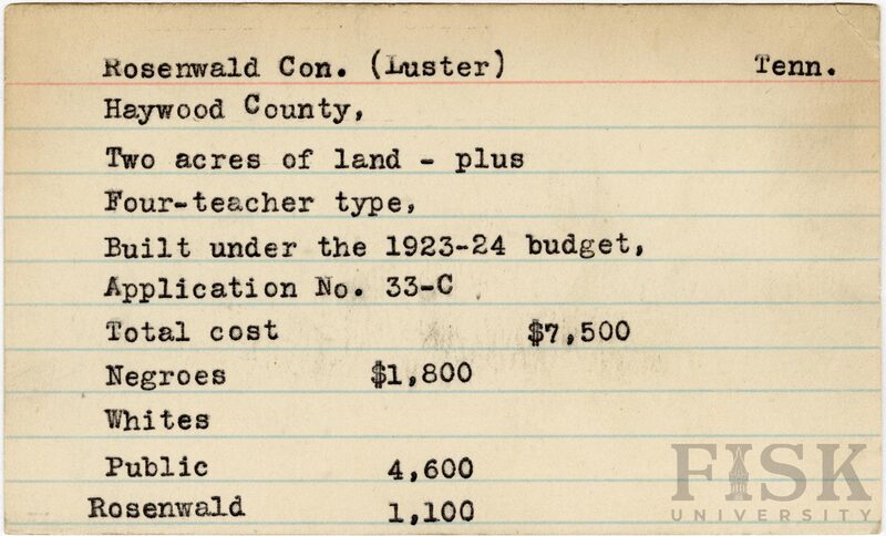 - School card from Rosenwald Fund for Rosenwald Consolidated School in Haywood County, Tennessee