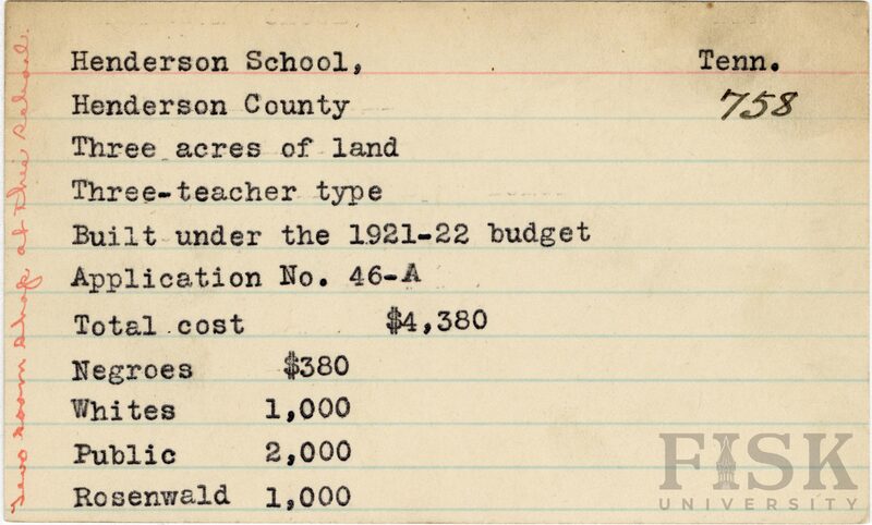 - School card from Rosenwald Fund for Henderson School in Henderson County, Tennessee with a note on the card that says, "two room shop at this school"