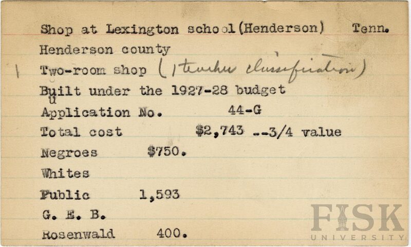 - School card from Rosenwald Fund for the two room shop at Henderson School in Henderson County, Tennessee with a section added to the budget contributions that says, "3/4 value" and a section for "G.E.B." with no monetary amount listed