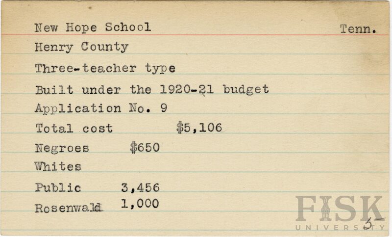 - School card from Rosenwald Fund for New Hope School in Henry County, Tennessee