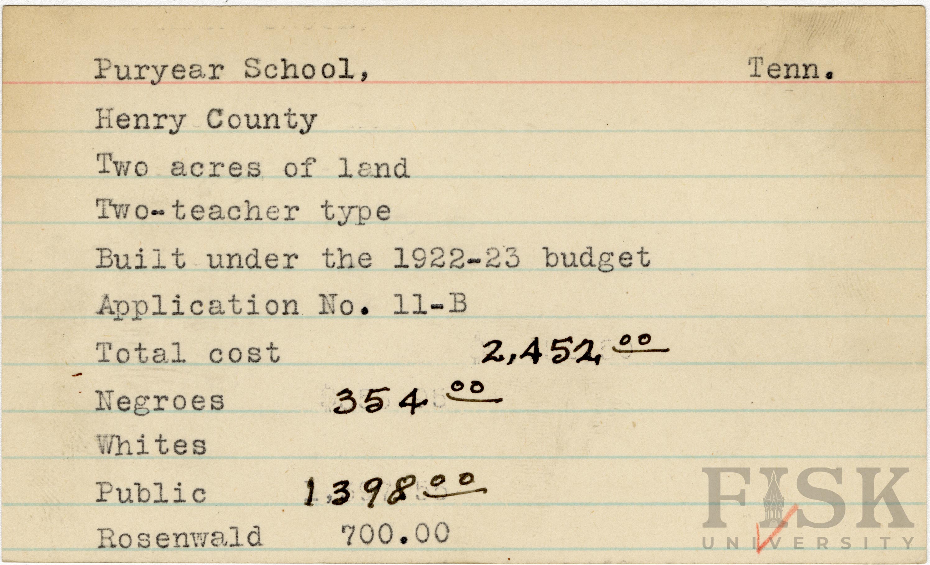 - School card from Rosenwald Fund for Puryear School in Henry County, Tennessee