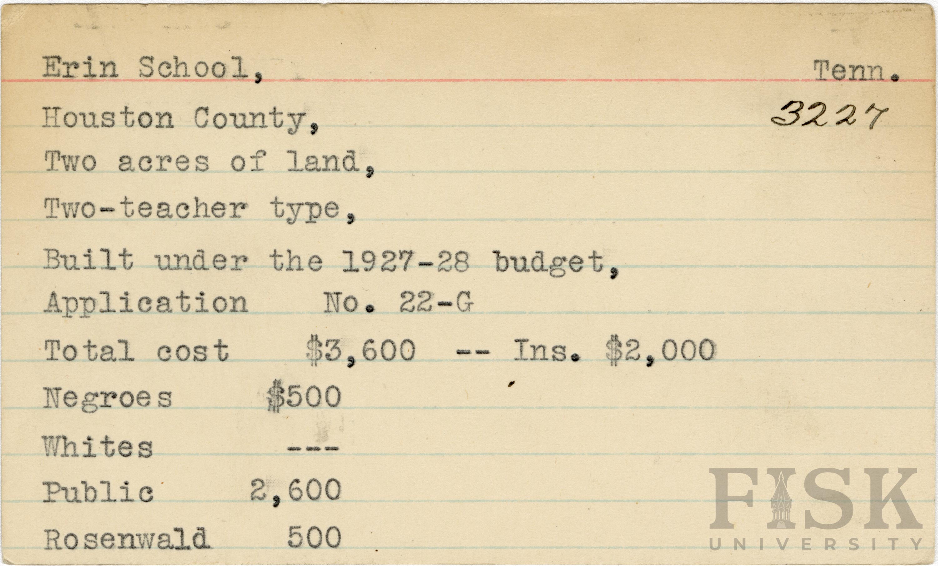 School card from Rosenwald Fund for Erin School in Houston County, Tennessee with a section added to the budget contributions that says, "Ins. $2,000"