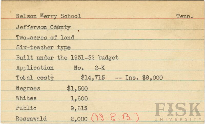 School card from Rosenwald Fund for Nelson Merry School in Jefferson County, Tennessee with a section added to the budget contributions that says, "Ins. $8,000" and an addition to the Rosenwald budget contribution that says, "(G.E.B.)"