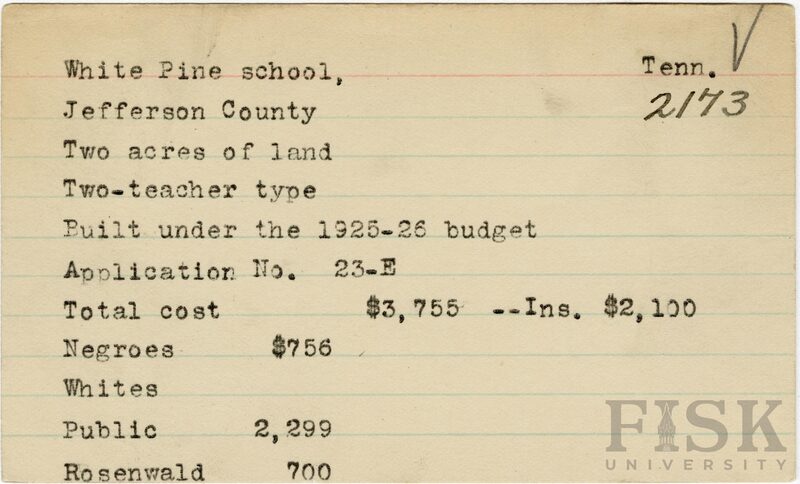 - School card from Rosenwald Fund for White Pine School in Jefferson County, Tennessee with a section added to the budget contributions that says, "Ins. $2,100"