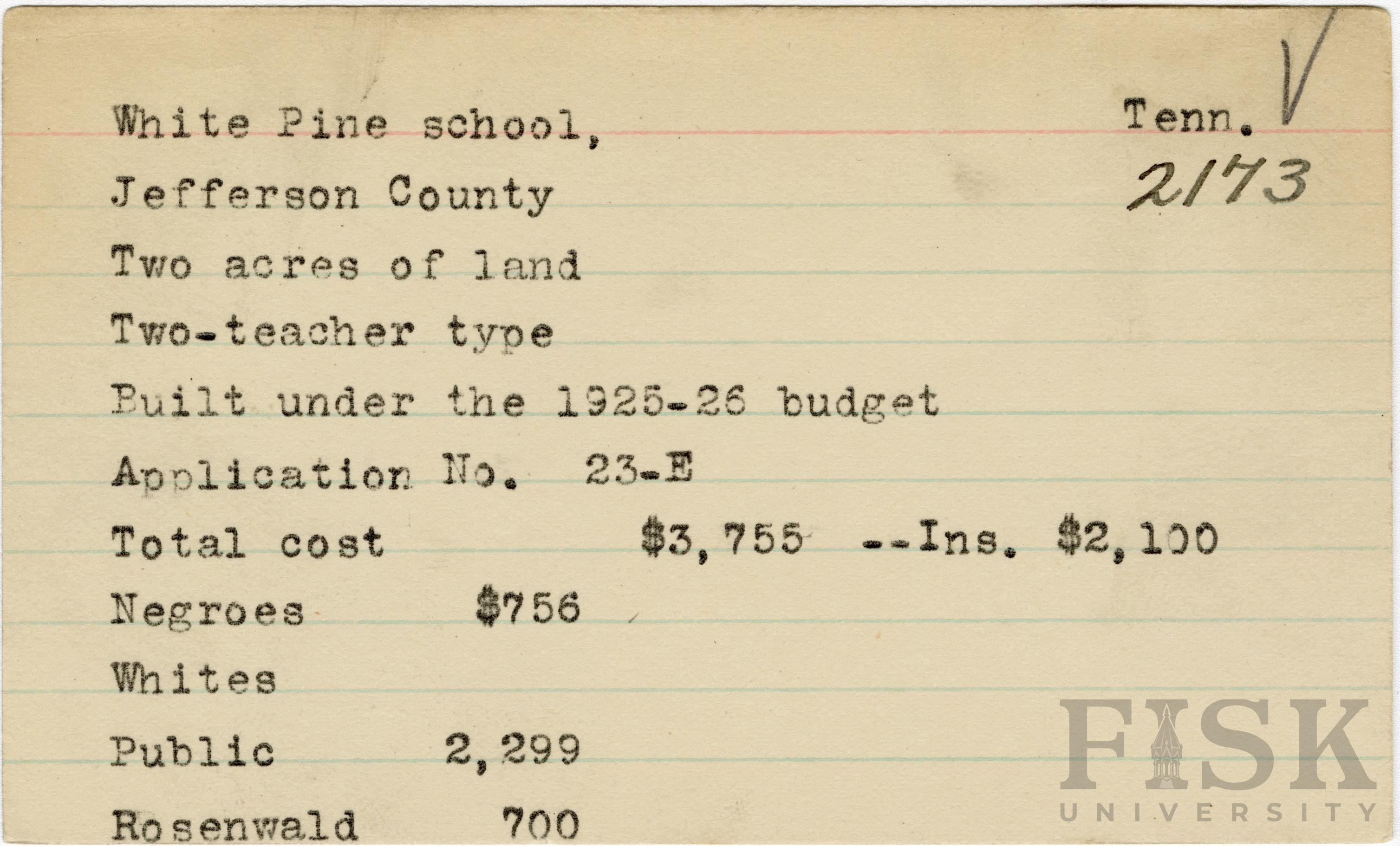 School card from Rosenwald Fund for White Pine School in Jefferson County, Tennessee with a section added to the budget contributions that says, "Ins. $2,100"