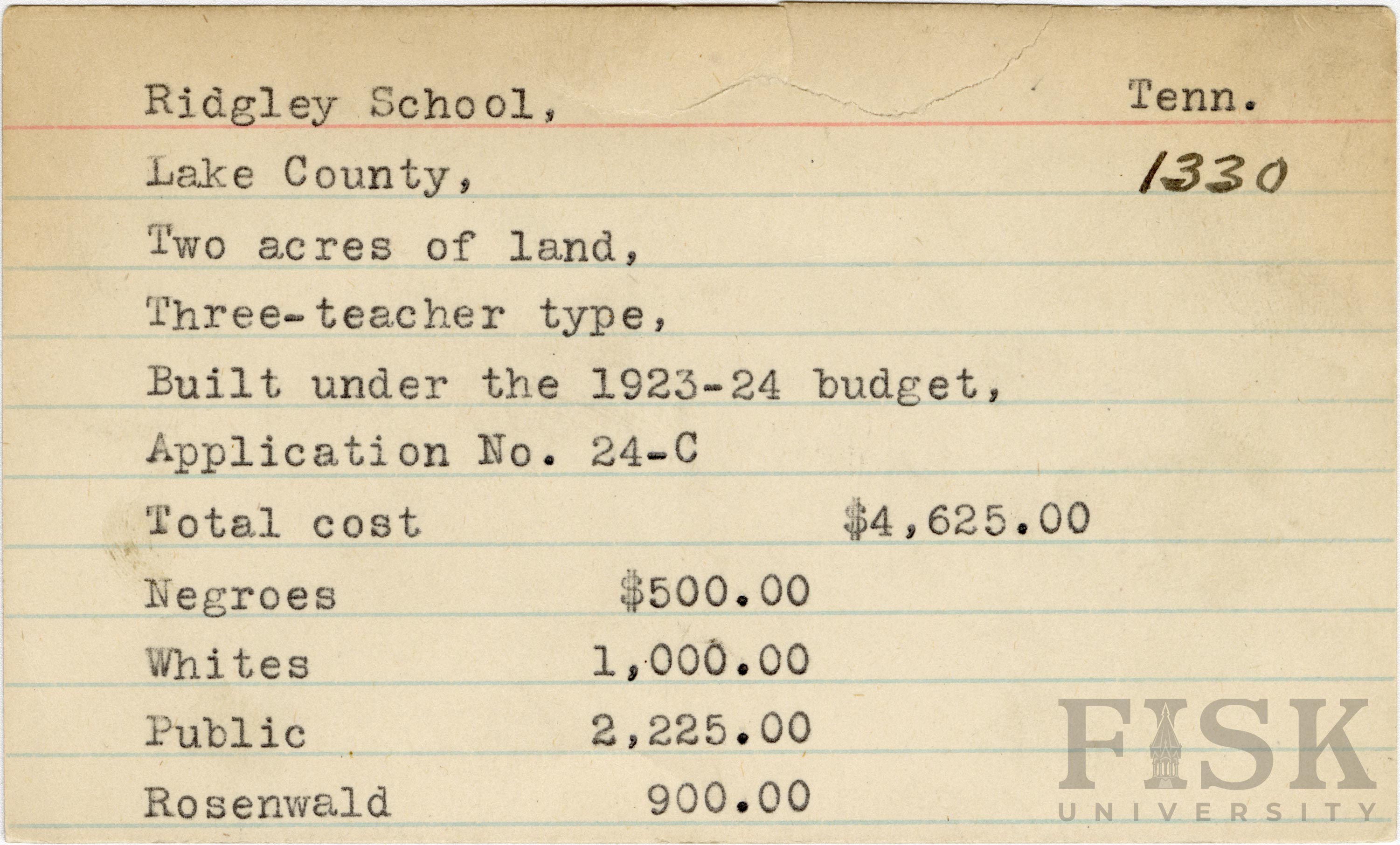 - School card from Rosenwald Fund for Ridgley School in Lake County, Tennessee