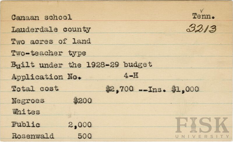 School card from Rosenwald Fund for Canaan School in Lauderdale County, Tennessee with a section added to the budget contributions that says, "Ins. $1,000"