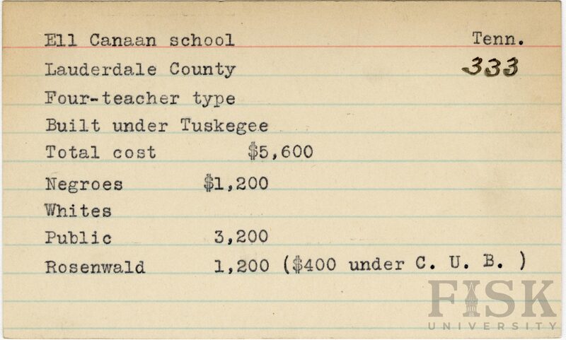 - School card from Rosenwald Fund for Ell Canaan School in Lauderdale County, Tennessee with an addition to the Rosenwald budget contribution that says, "($400 under C.U.B.)"