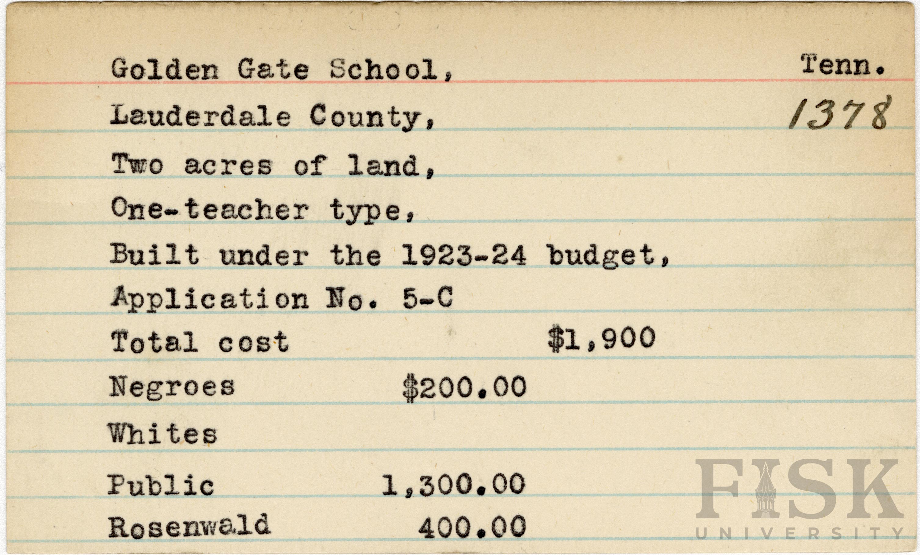 - School card from Rosenwald Fund for Golden Gate School in Lauderdale County, Tennessee
