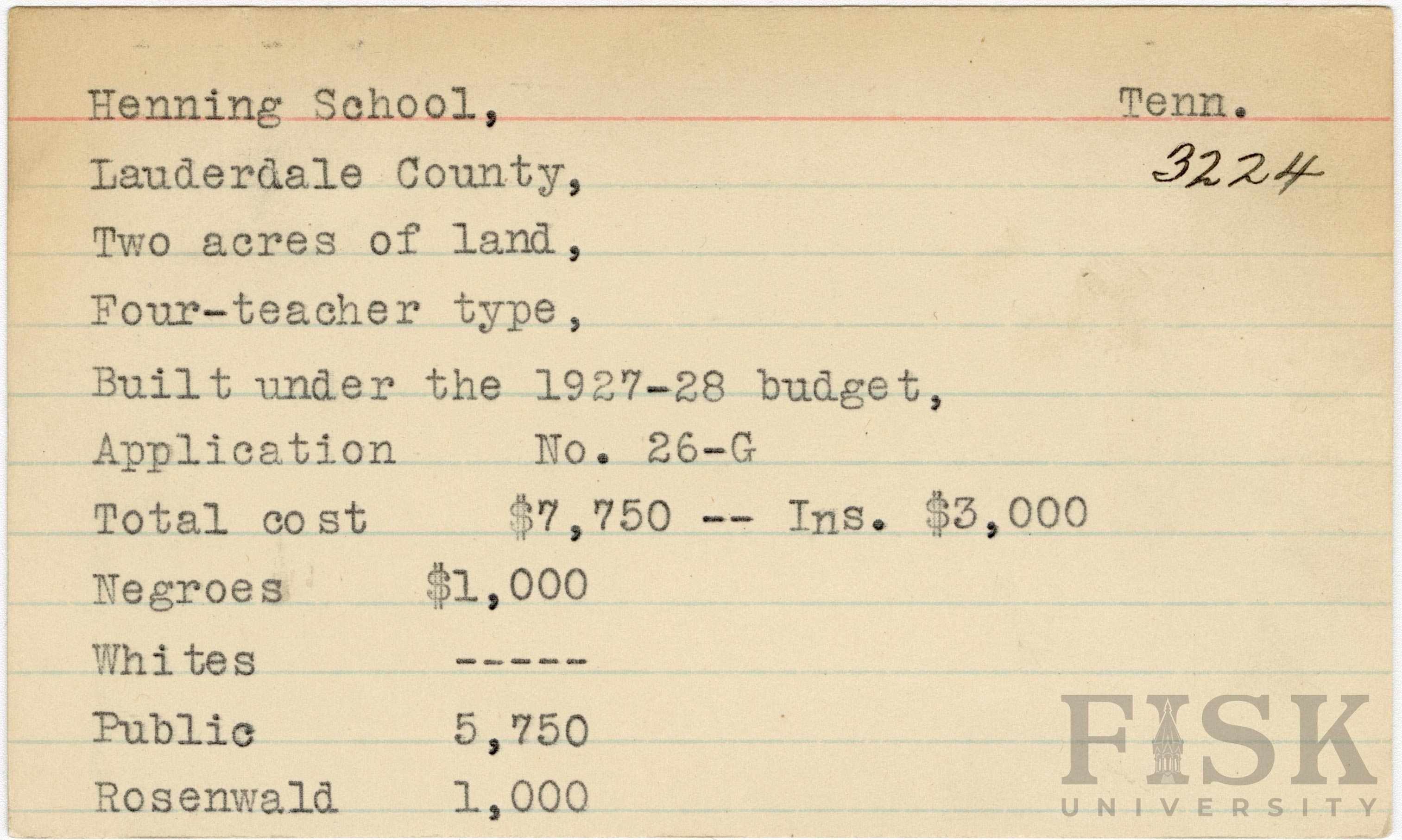 School card from Rosenwald Fund for Henning School in Lauderdale County, Tennessee with a section added to the budget contributions that says, "Ins. $3,000"