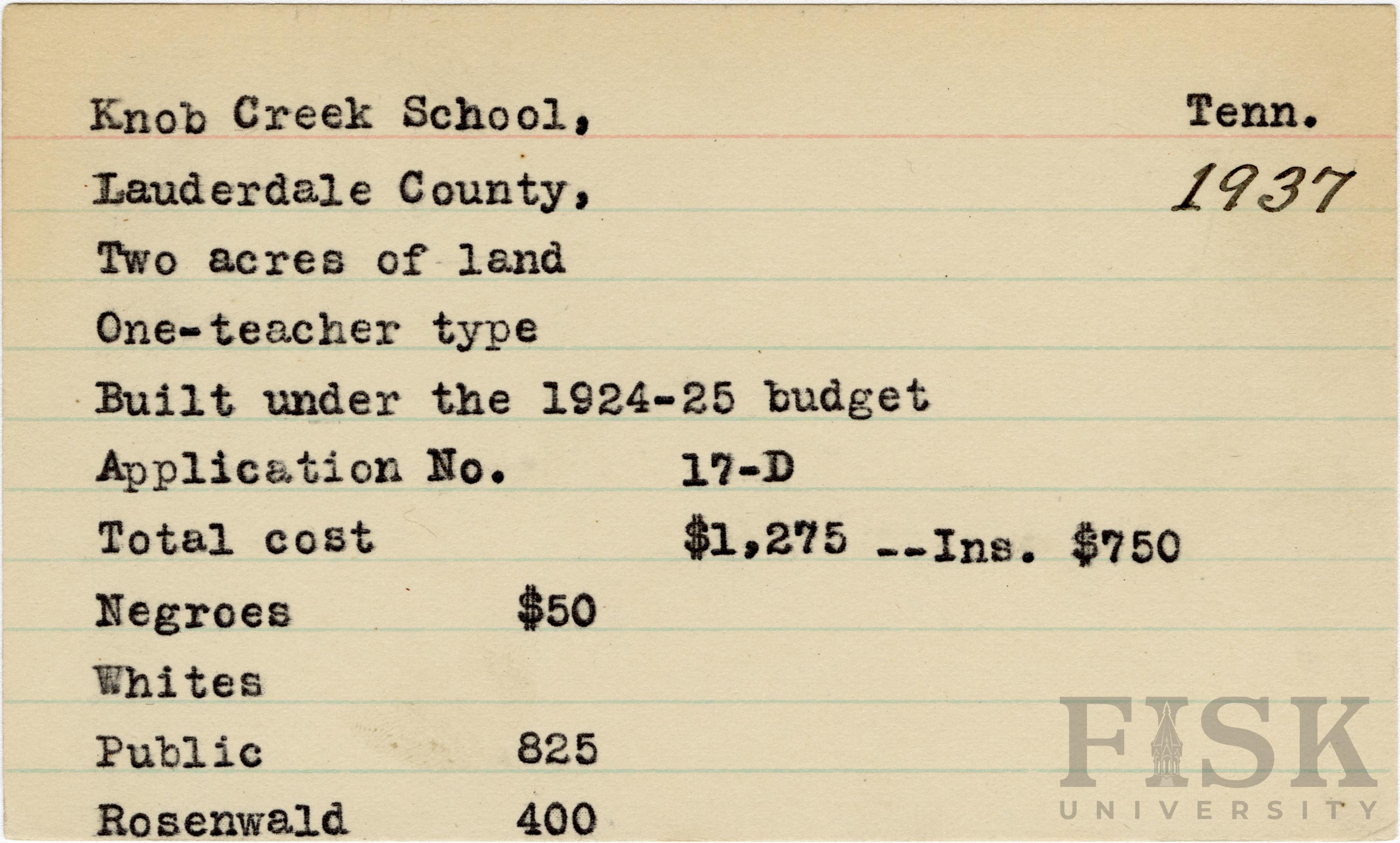 School card from Rosenwald Fund for Knob Creek School in Lauderdale County, Tennessee with a section added to the budget contributions that says, "Ins. $750"