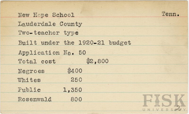 - School card from Rosenwald Fund for New Hope School in Lauderdale County, Tennessee