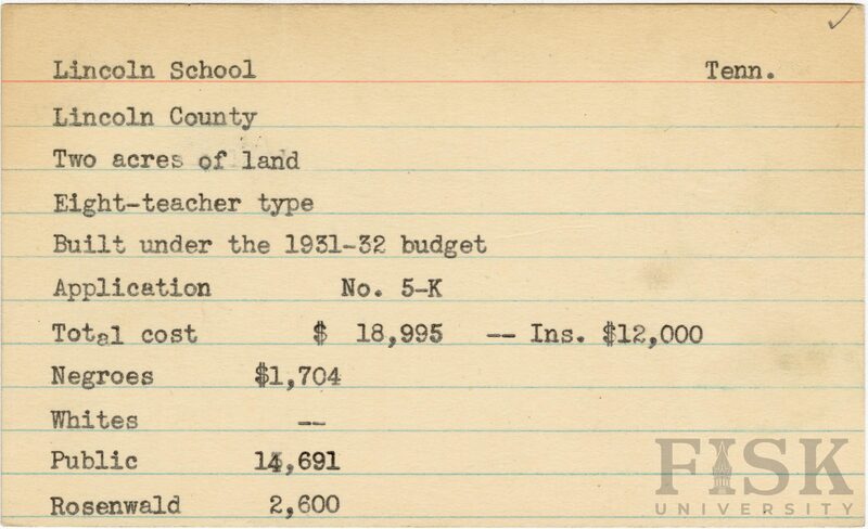 School card from Rosenwald Fund for Lincoln School in Lincoln County, Tennessee with a section added to the budget contributions that say, "Ins. $12,000"