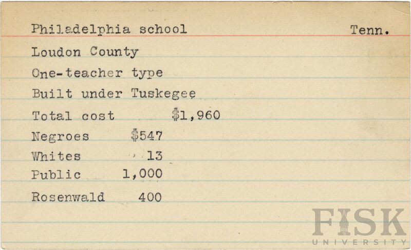 - School card from Rosenwald Fund for Philadelphia School in Loudon County, Tennessee