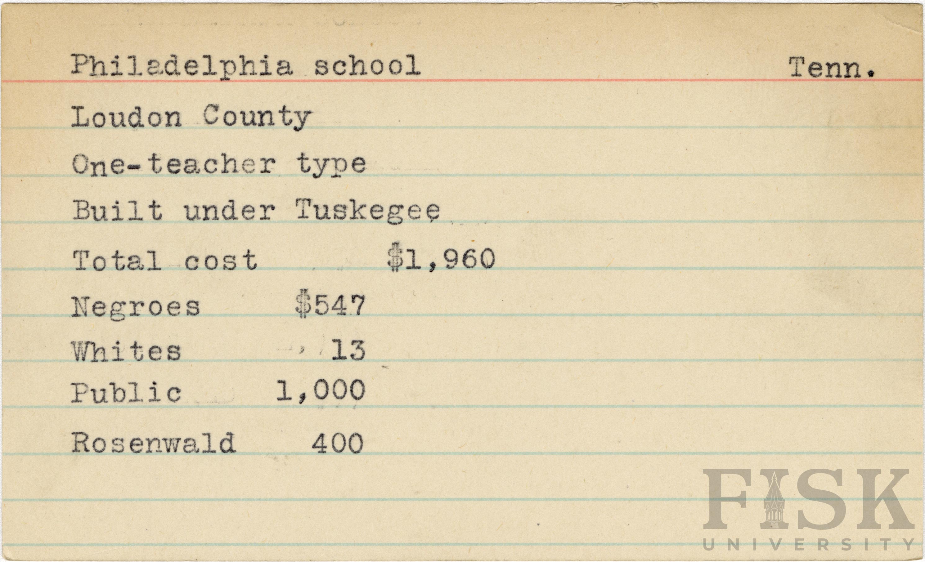 School card from Rosenwald Fund for Philadelphia School in Loudon County, Tennessee
