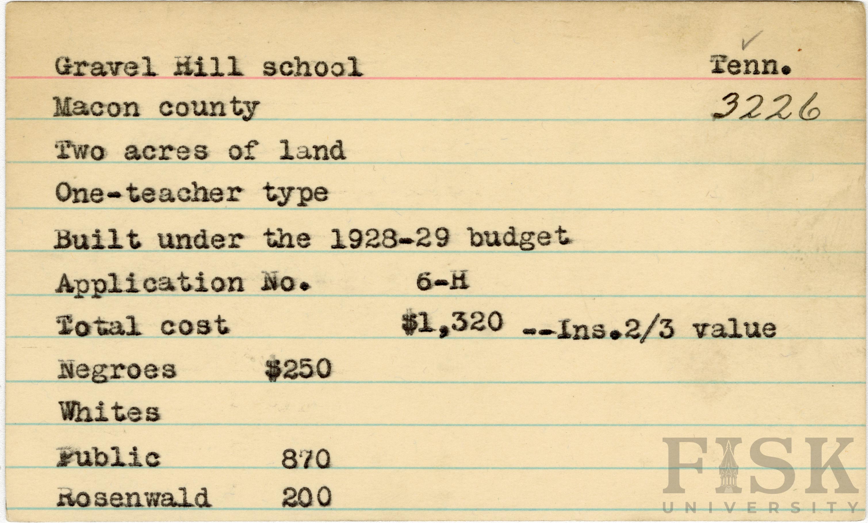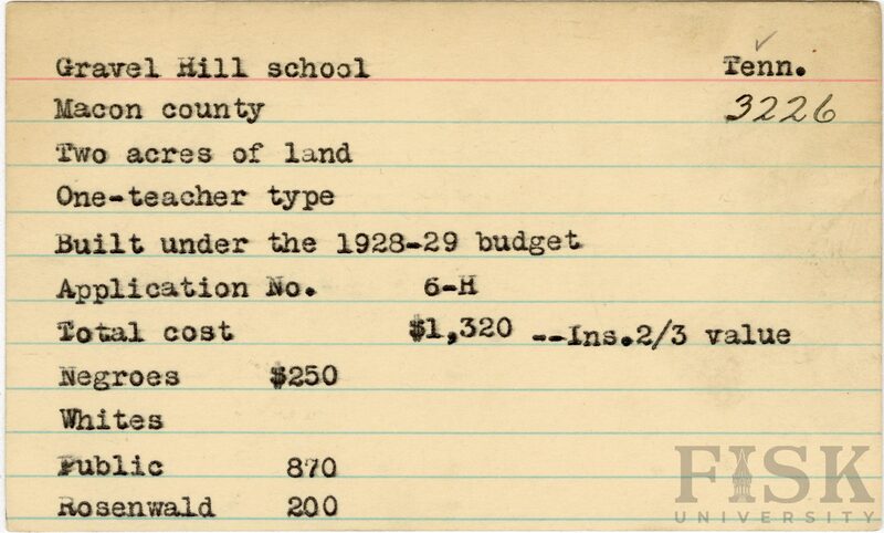 - School card from Rosenwald Fund for Gravel Hill School in Macon County, Tennessee with a section added to the budget contributions that says, "Ins. 2/3 value"