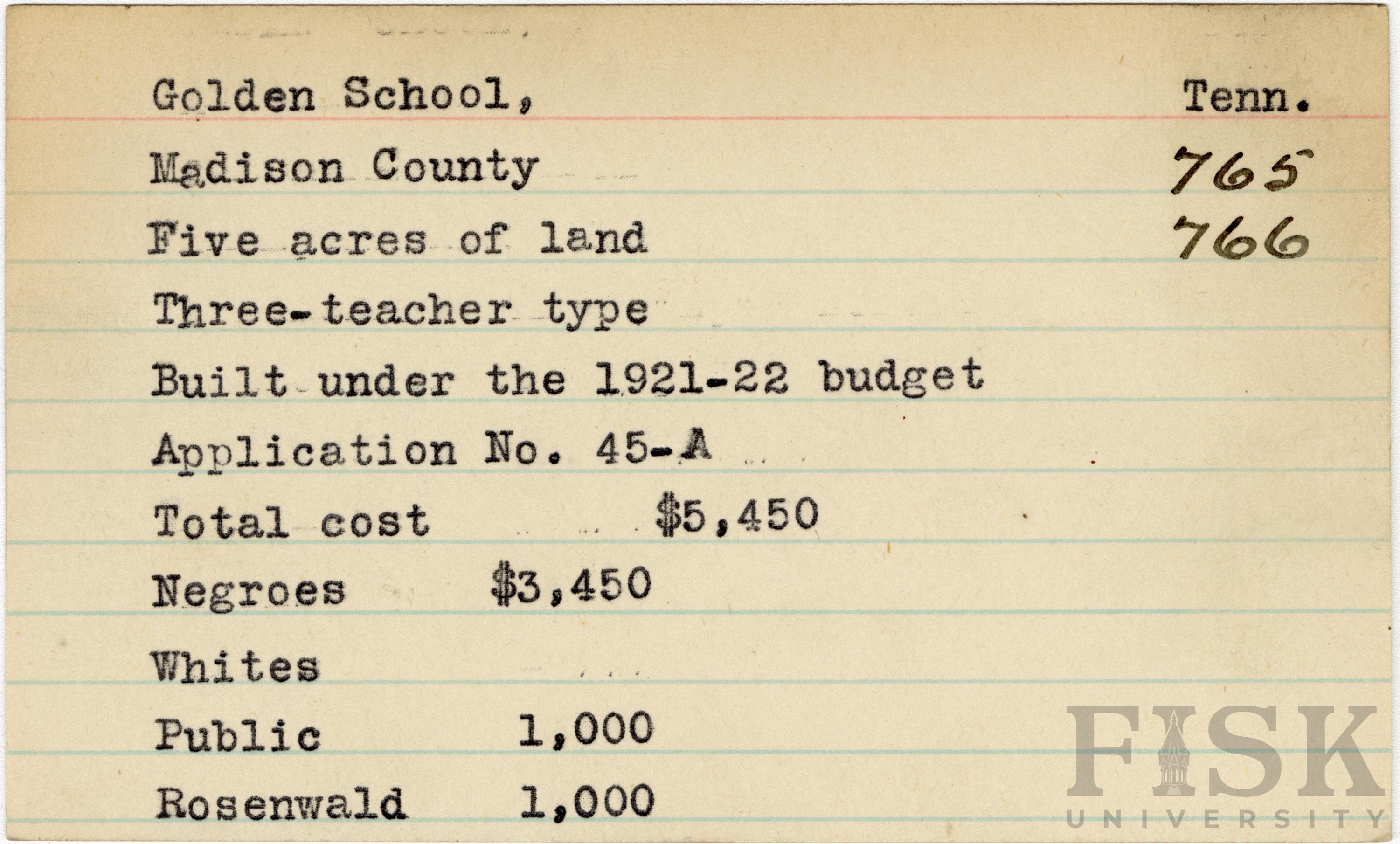 - School card from Rosenwald Fund for Golden School in Madison County, Tennessee