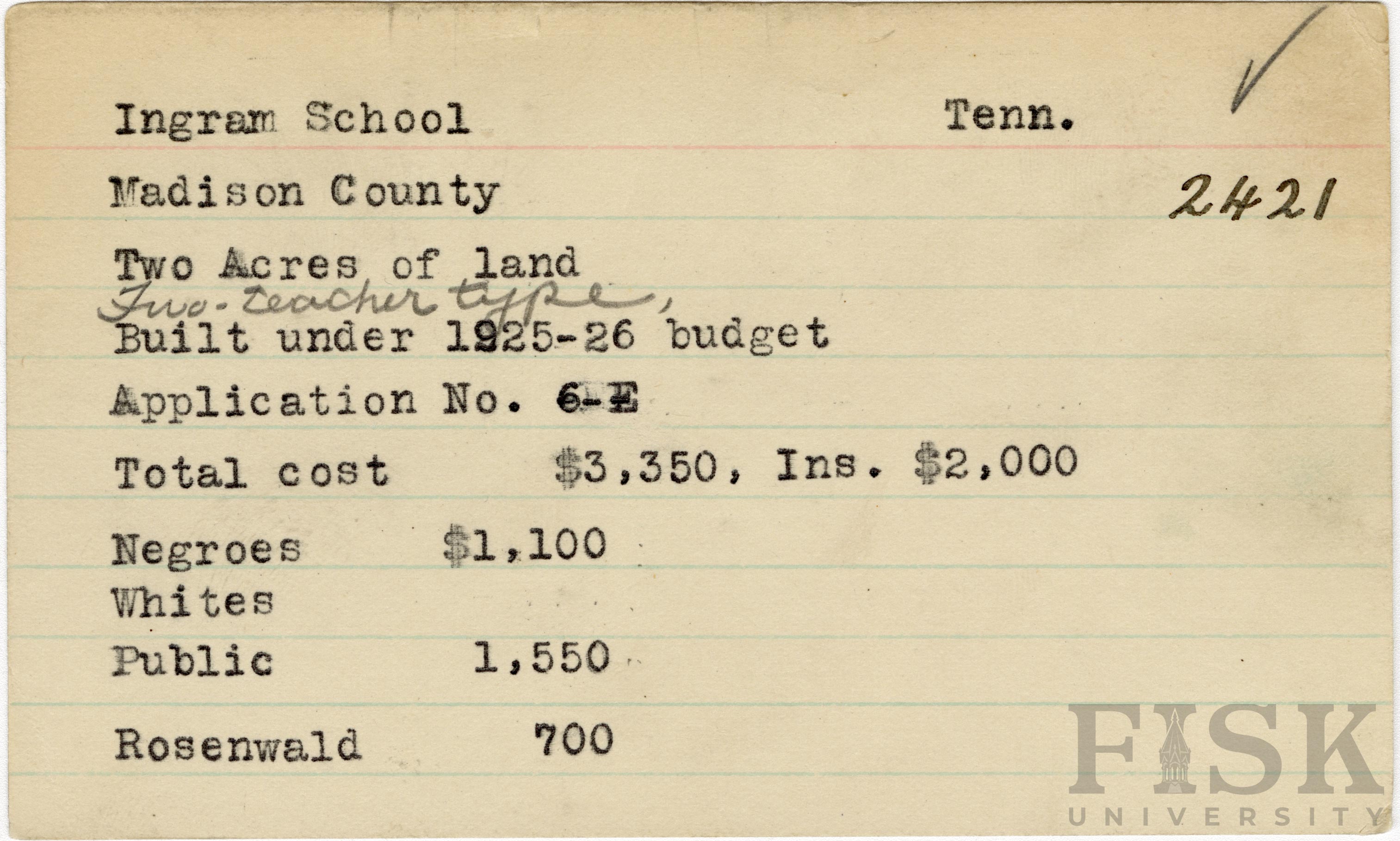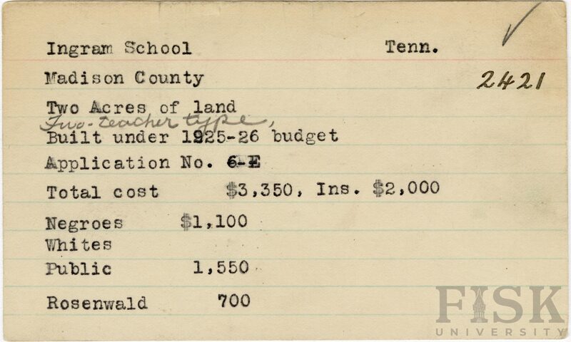 School card from Rosenwald Fund for Ingram School in Madison County, Tennessee with a section added to the budget contributions that says, "Ins. $2,000"