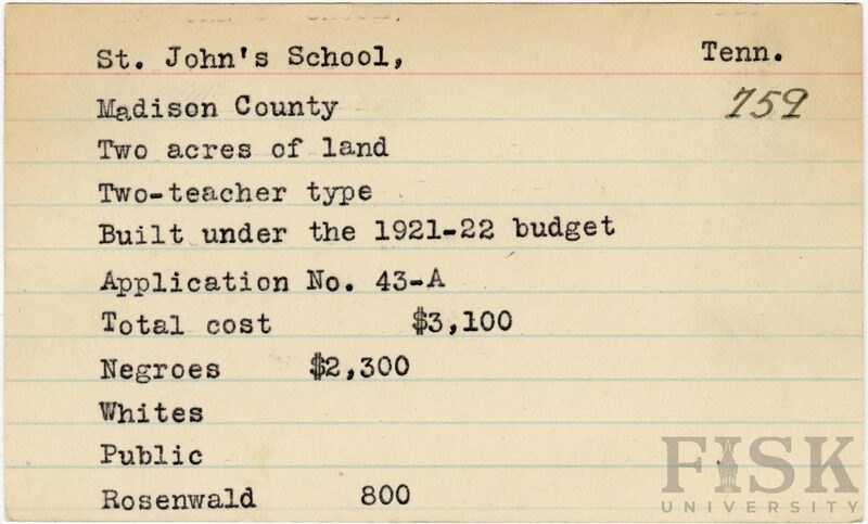 - School card from Rosenwald Fund for St. John's School in Madison County, Tennessee