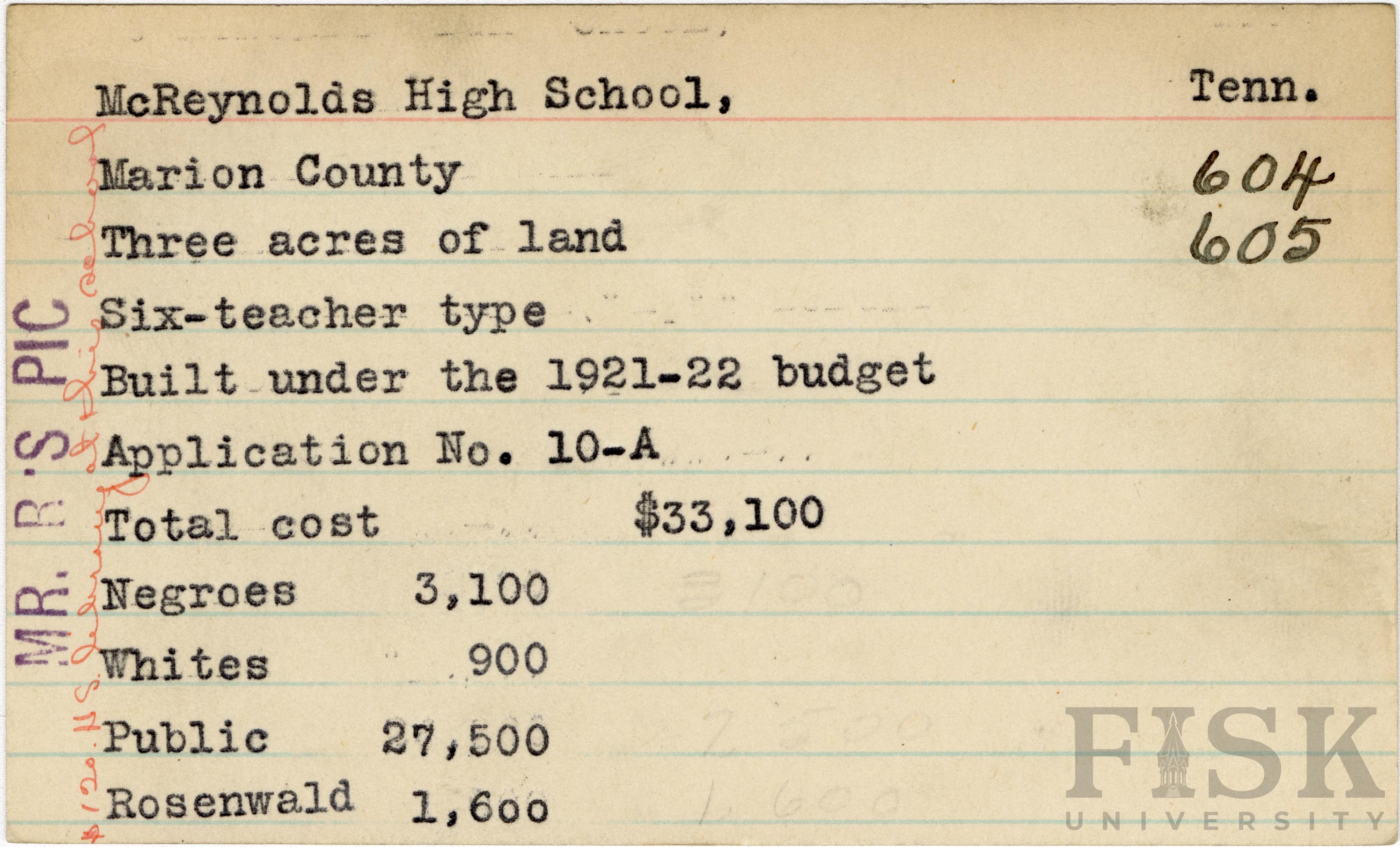 - School card from Rosenwald Fund for McReynolds High School in Marion County, Tennessee with notes on the card that say, "Mr. R's Pic" and "$120 H.S. library at this school"