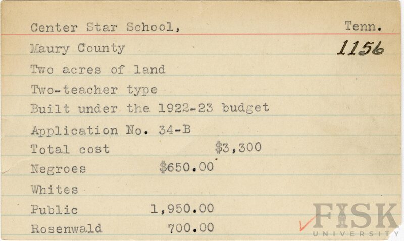 - School card from Rosenwald Fund for Center Star School in Maury County, Tennessee