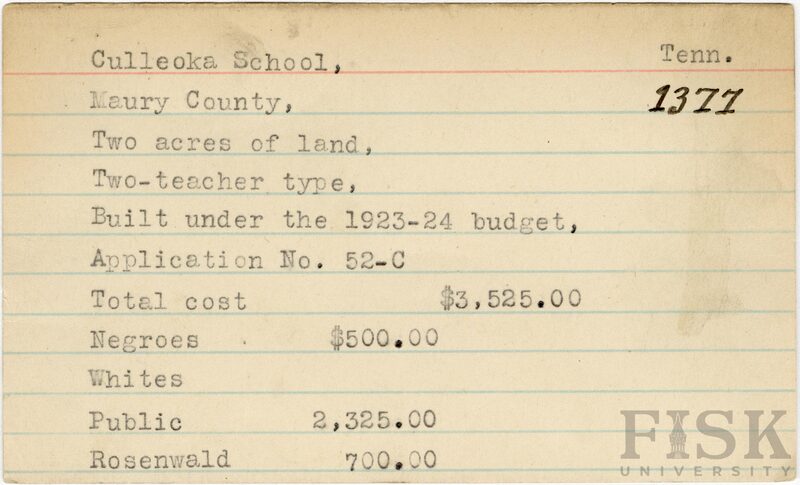 - School card from Rosenwald Fund for Culleoka School in Maury County, Tennessee