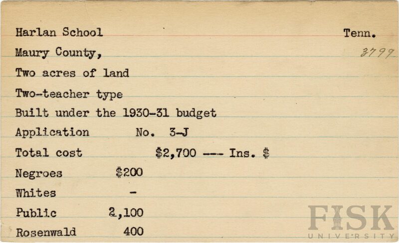 - School card from Rosenwald Fund for Harlan School in Maury County, Tennessee