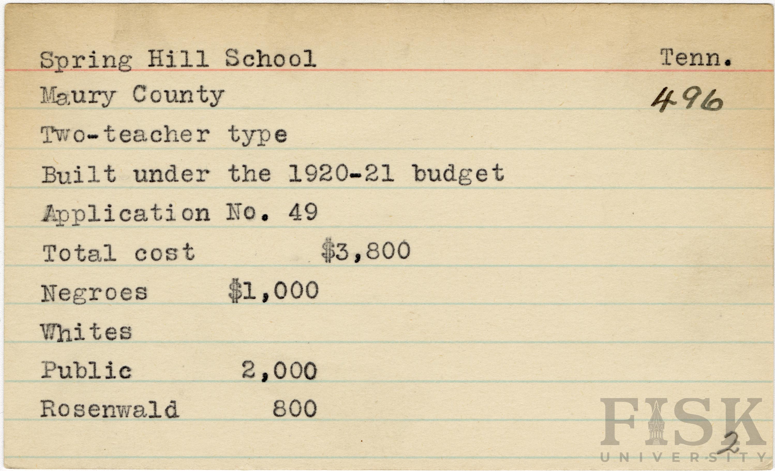 - School card from Rosenwald Fund for Spring Hill School in Maury County, Tennessee