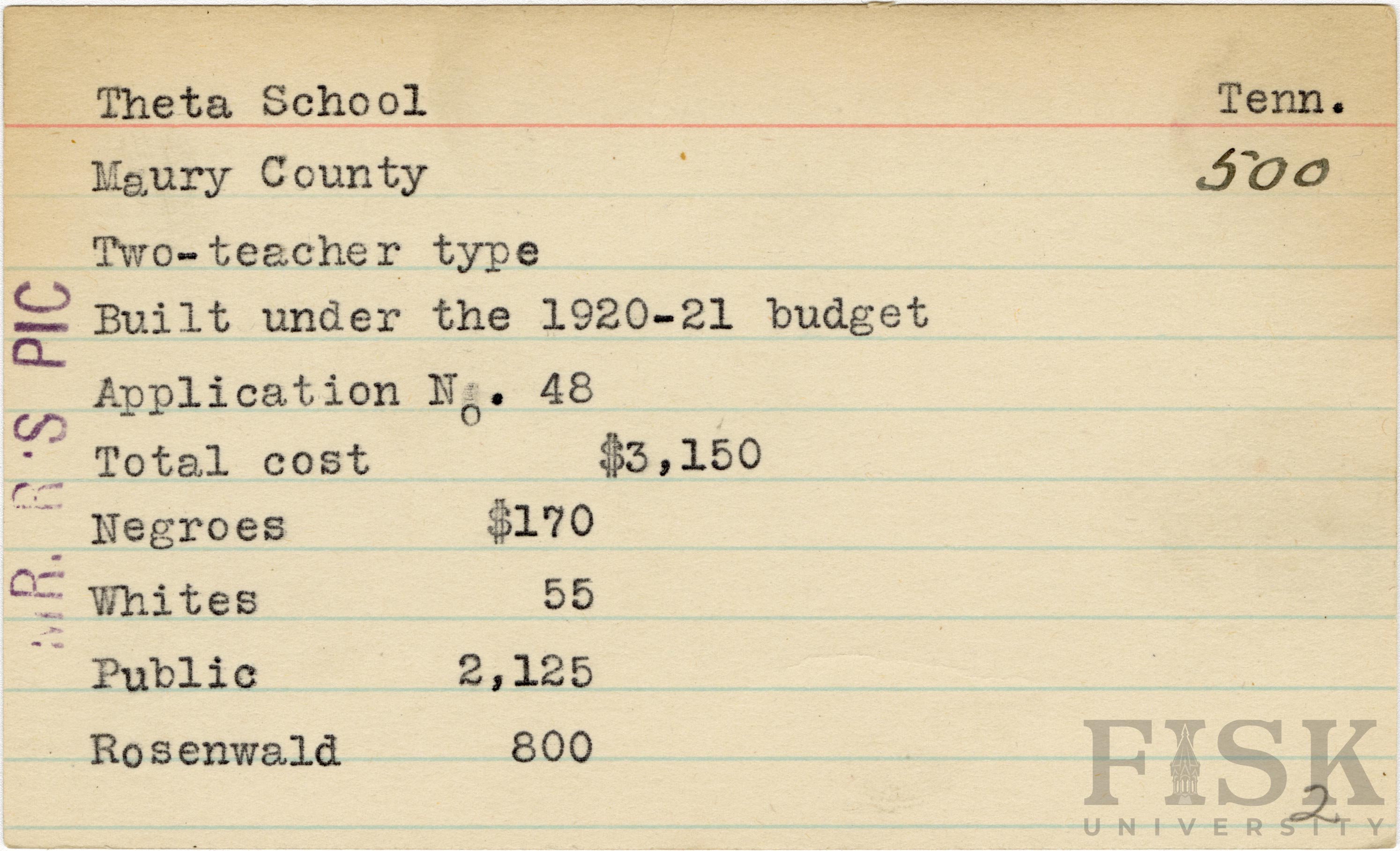 - School card from Rosenwald Fund for Theta School in Maury County, Tennessee with a note on the card that says, "Mr. R's Pic"