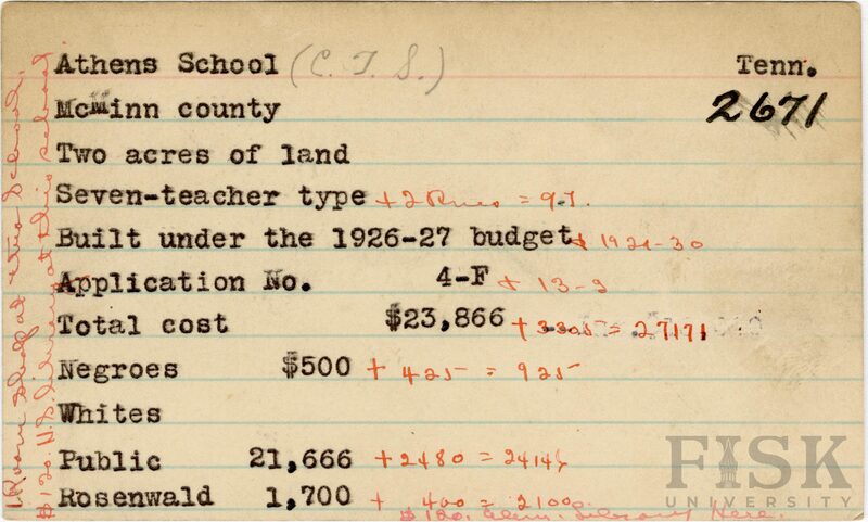 - School card from Rosenwald Fund for Athens School in McMinn County, Tennessee with handwritten additions to the teacher type, budget year, application number, and budget contribution sections. Notes on the card say, "1 room shop at this school," "$120 H.S. library at this school," and "$120 elem library here"