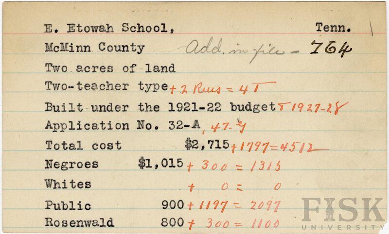 - School card from Rosenwald Fund for E. Etowah County, Tennessee with handwritten additions to the teacher type, budget year, application number, and budget contribution sections. A note on the card says, "Add. In file"