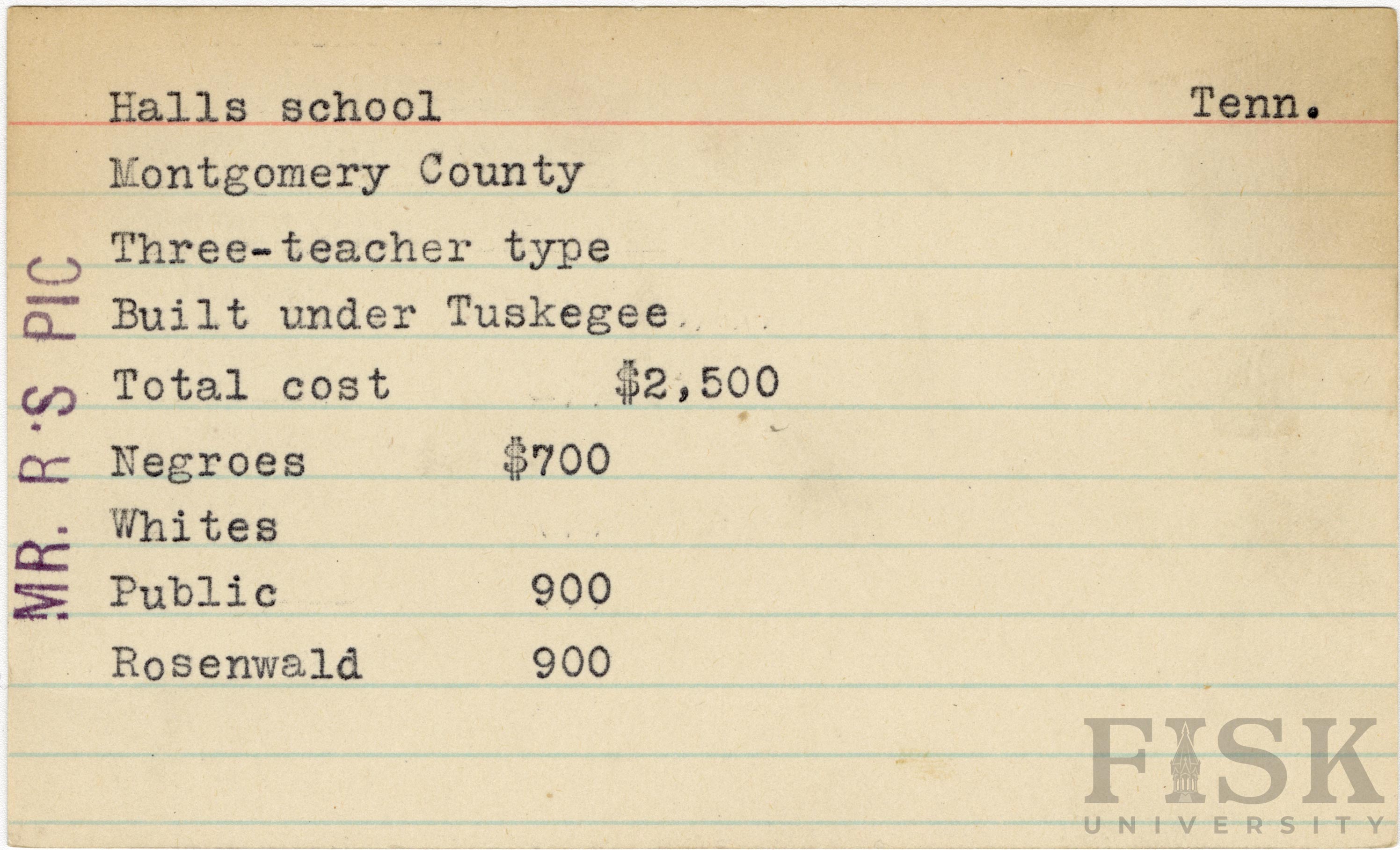 - School card from Rosenwald Fund for Halls School in Montgomery County, Tennessee with a note on the card that says, "Mr. R's Pic"
