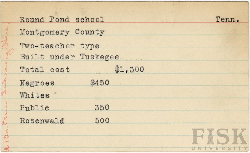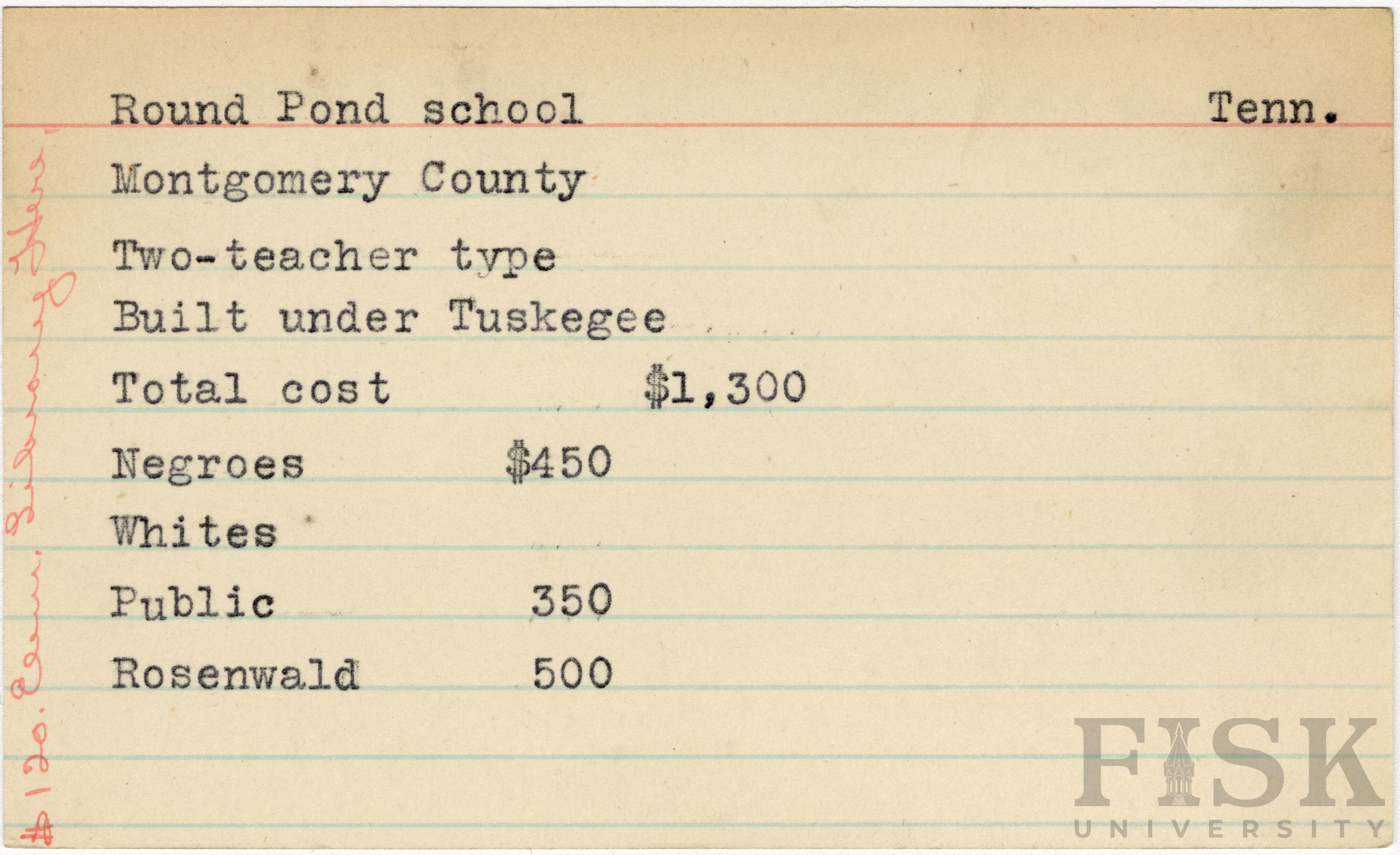 - School card from Rosenwald Fund for Round Pond School in Montgomery County, Tennessee with a note on the card that says, "$120 elem library here"