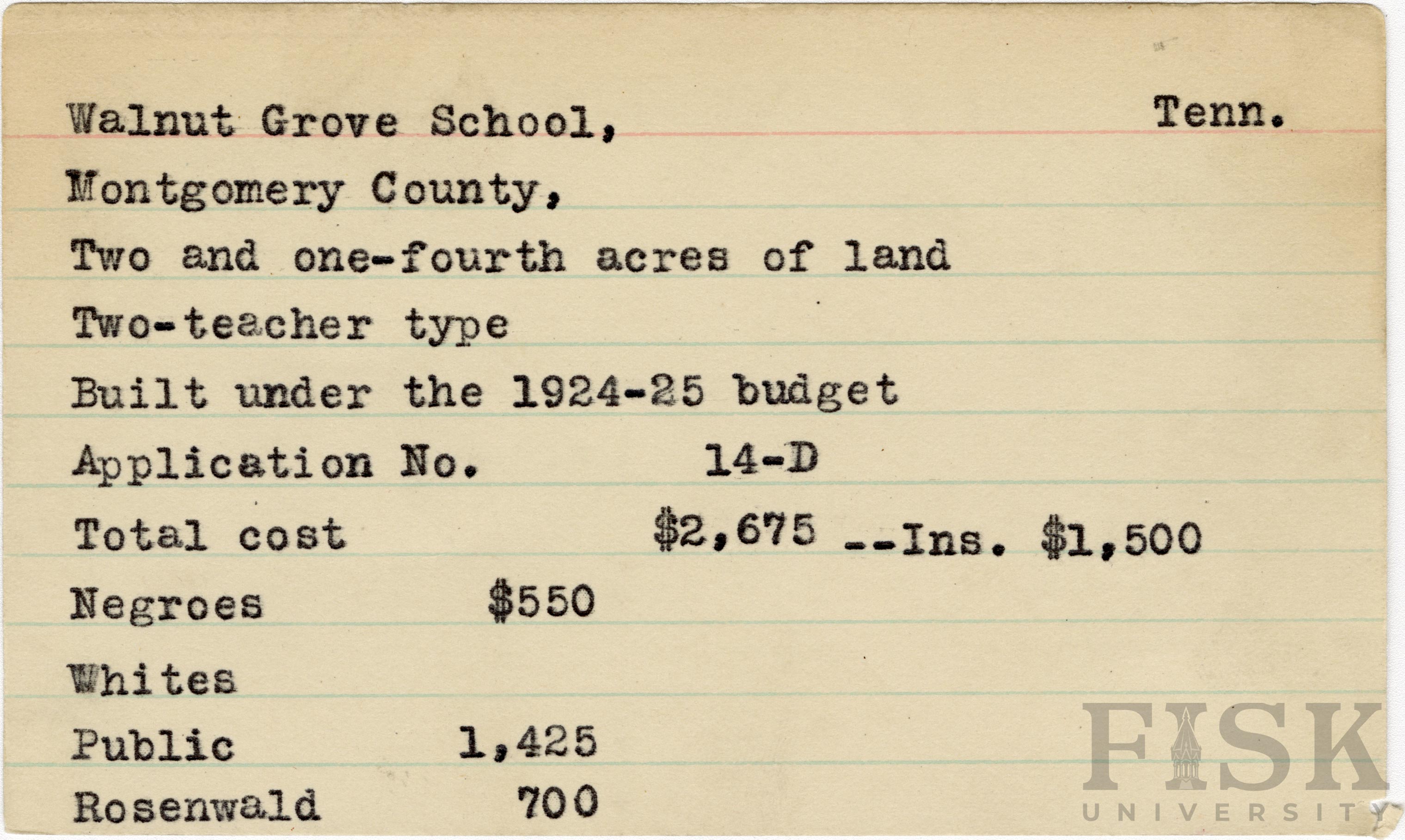 School card from Rosenwald Fund for Walnut Grove School in Montgomery County, Tennessee with a section added to the budget contributions that says, "Ins. $1,500"