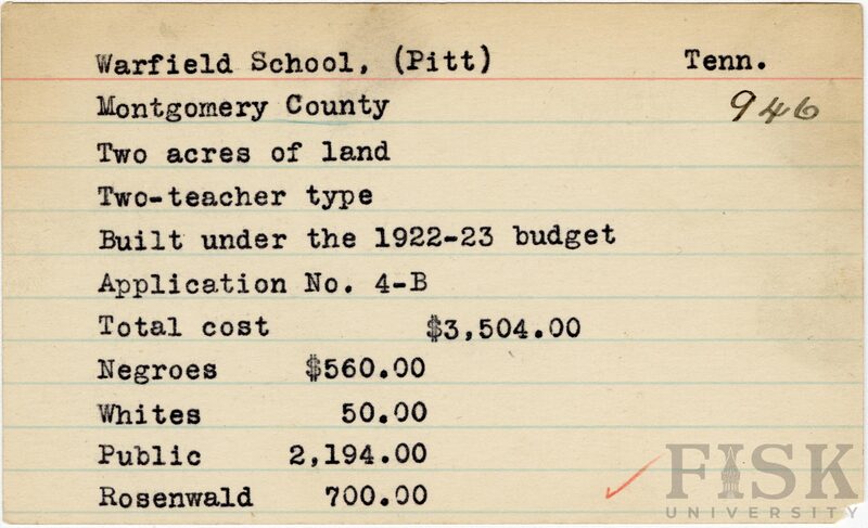 - School card from Rosenwald Fund for Warfield School in Montgomery County, Tennessee
