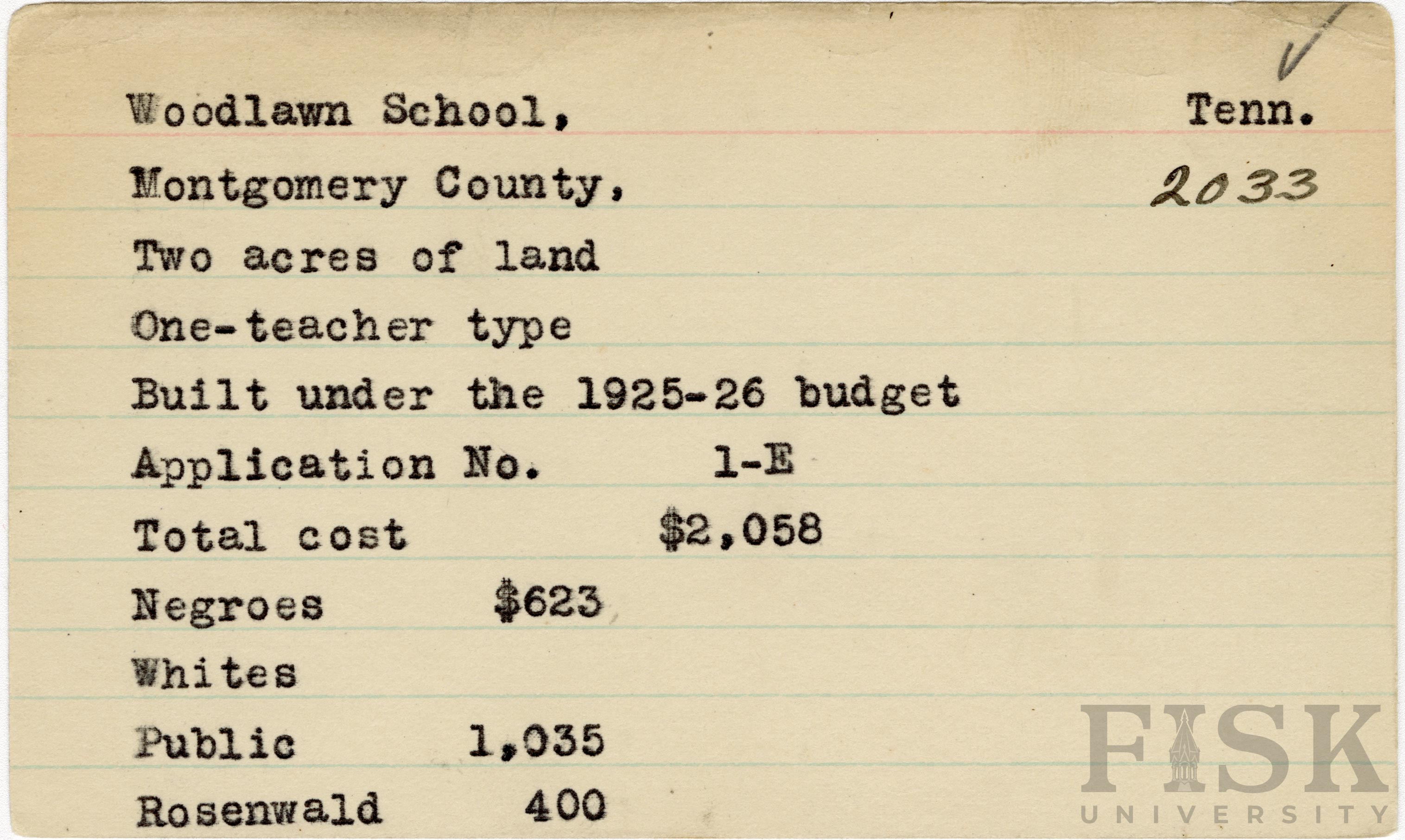 - School card from Rosenwald Fund for Woodlawn School in Montgomery County, Tennessee
