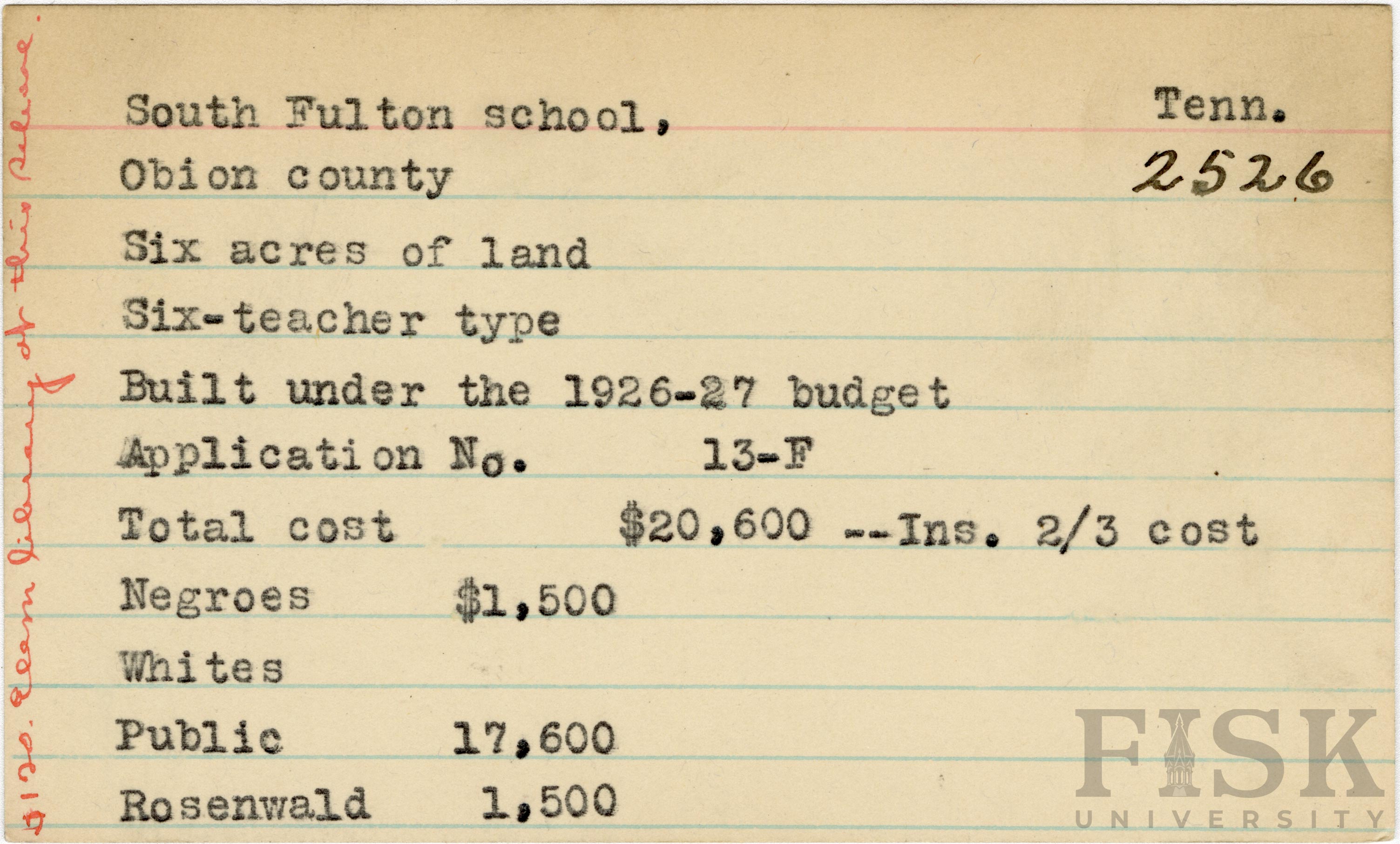 - School card from Rosenwald Fund for South Fulton School in Obion County, Tennessee with a section added to the budget contributions that says, "Ins. 2/3 cost" and a note that says, "$120 elem library at this school"