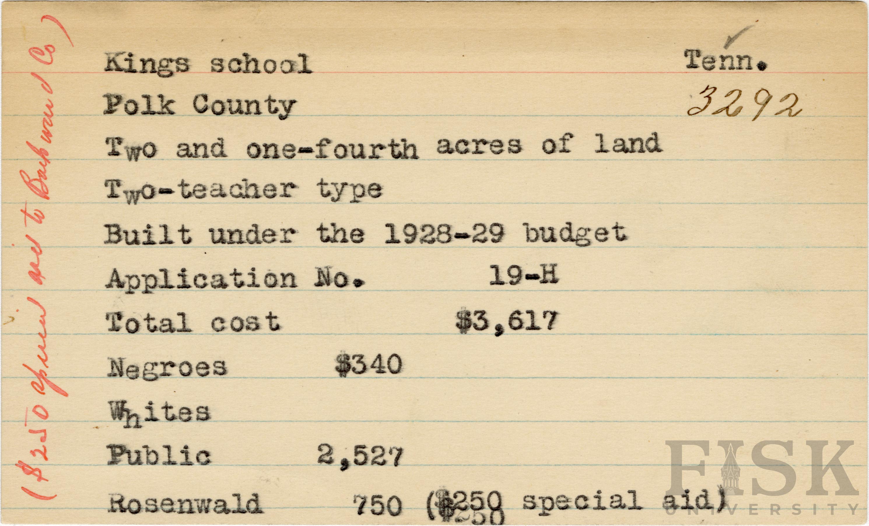 School card from Rosenwald Fund for Kings School in Polk County, Tennessee with notes on the card that say, "($250 special aid)" and "($250 special aid to Backward Co.)"