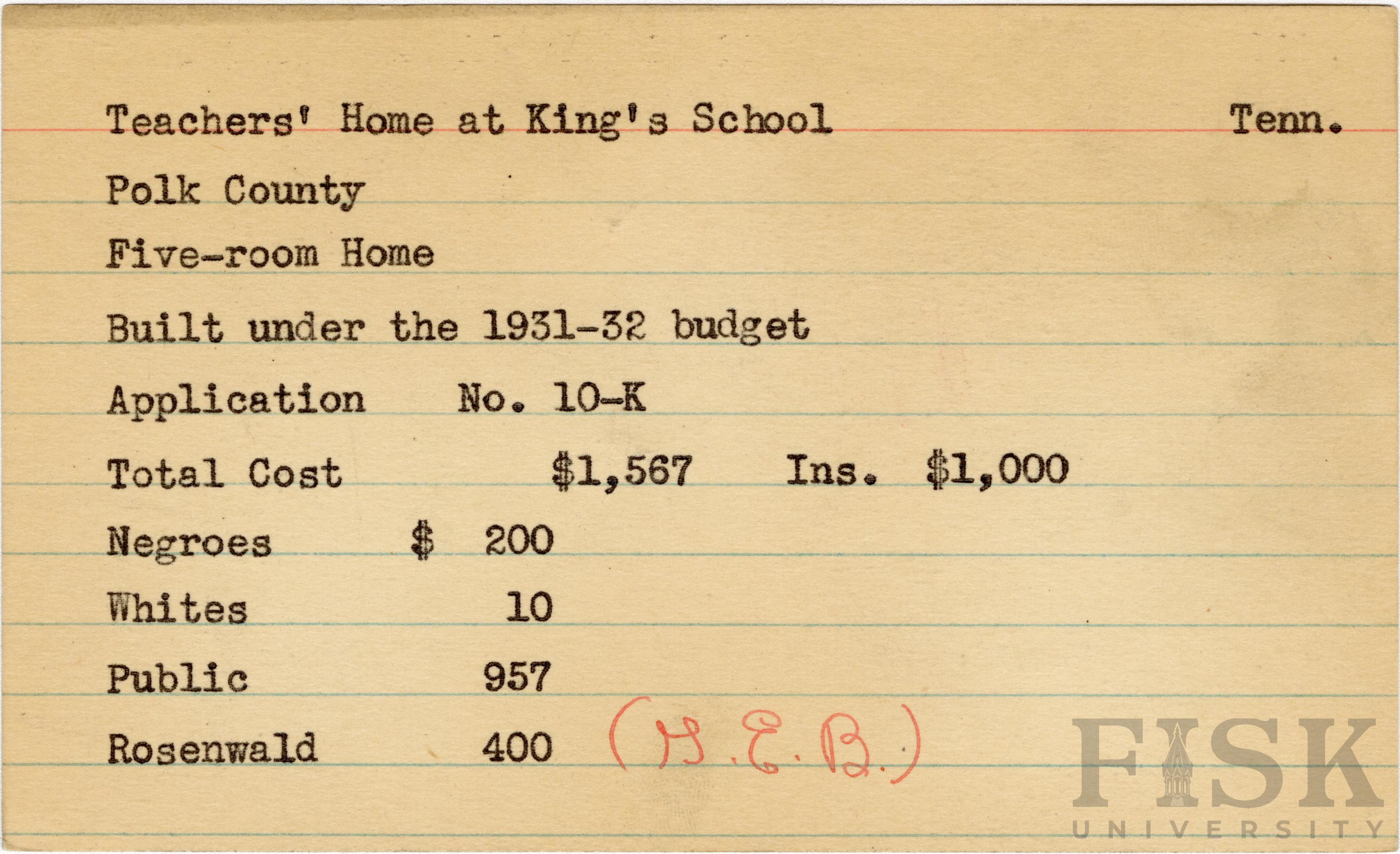 - School card from Rosenwald Fund for the five room teacher's home at Kings School in Polk County, Tennessee with a section added to the budget contributions that says, "Ins. $1,000" and an addition to the Rosenwald budget contribution that says, "(G.E.B.)"