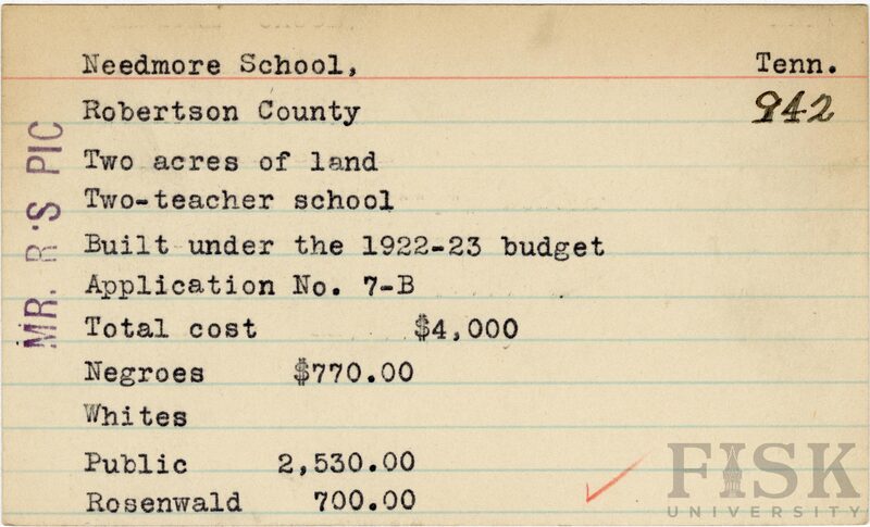 School card from Rosenwald Fund for Needmore School in Robertson County, Tennessee with a note on the card that says, "Mr. R's Pic"