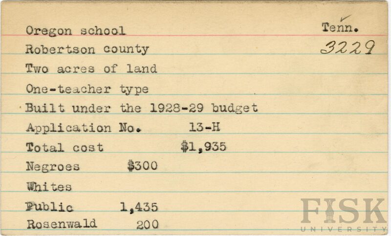 - School card from Rosenwald Fund for Oregon School in Robertson County, Tennessee