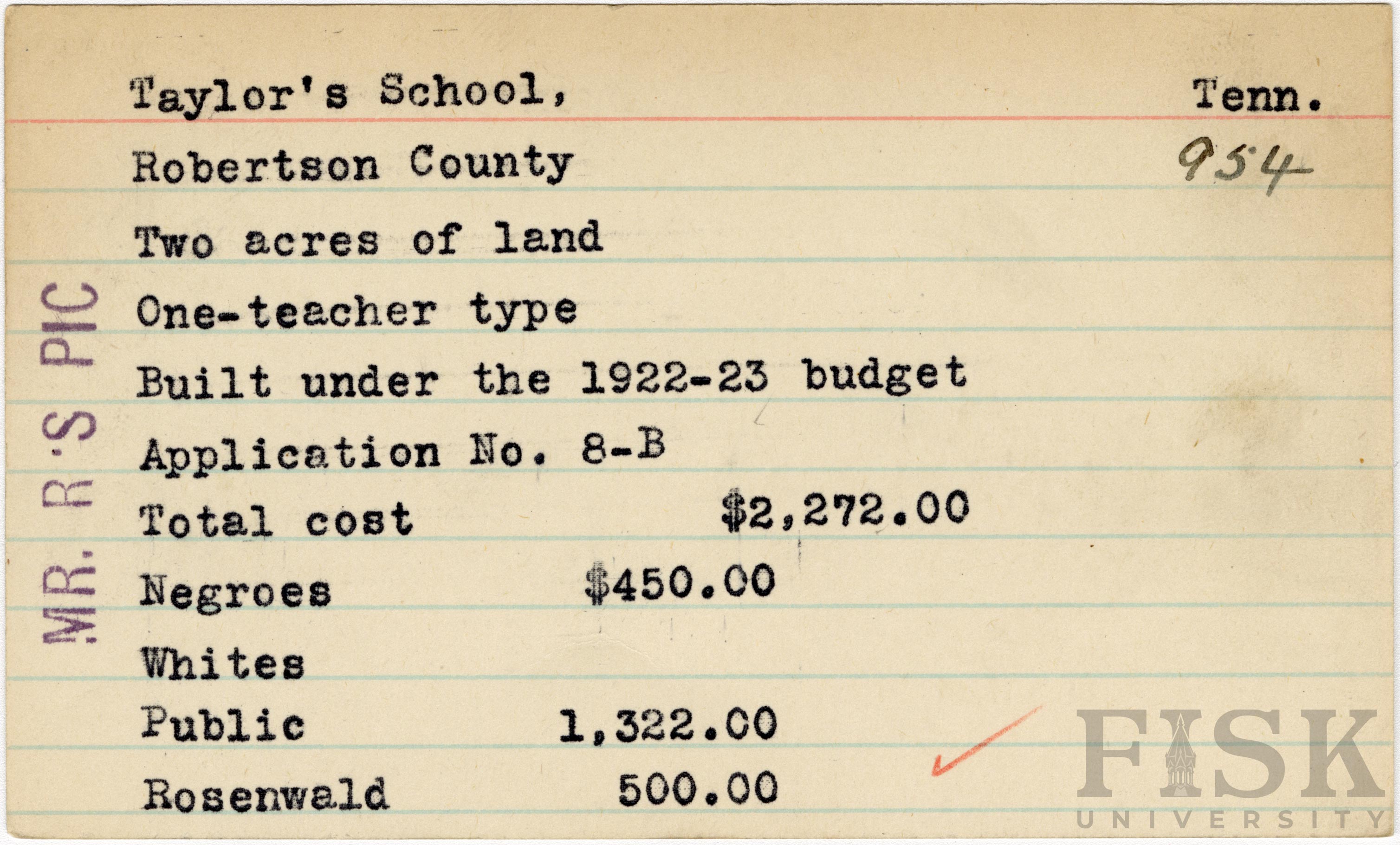 School card from Rosenwald Fund for Taylor's School in Robertson County, Tennessee with a note on the card that says, "Mr. R's Pic"