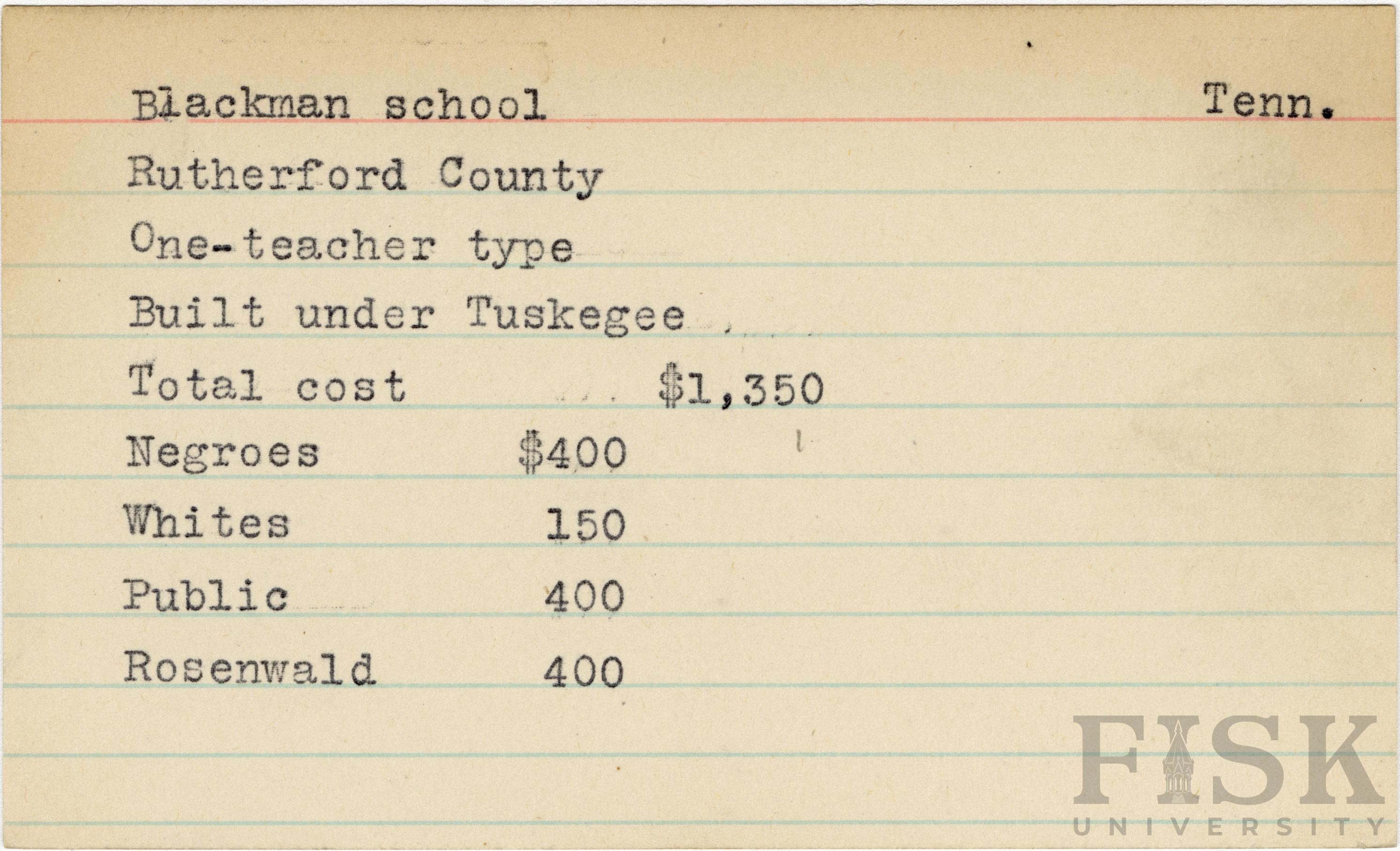- School card from Rosenwald Fund for Blackman School in Rutherford County, Tennessee