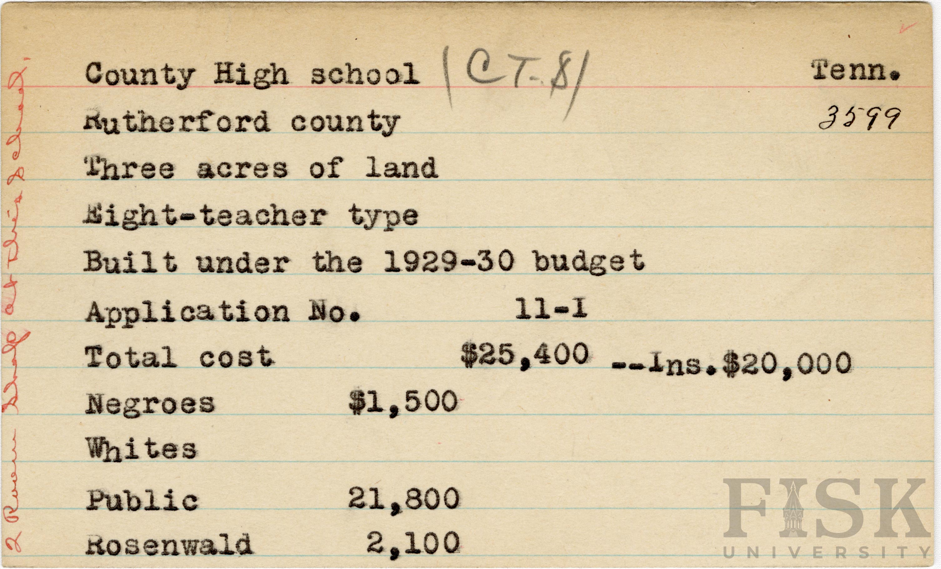 - School card from Rosenwald Fund for Murfreesboro School in Rutherford County, Tennessee with a section added to the budget contributions that says, "Ins. $20,000" and a note on the card that says, "2 room shop at this school"