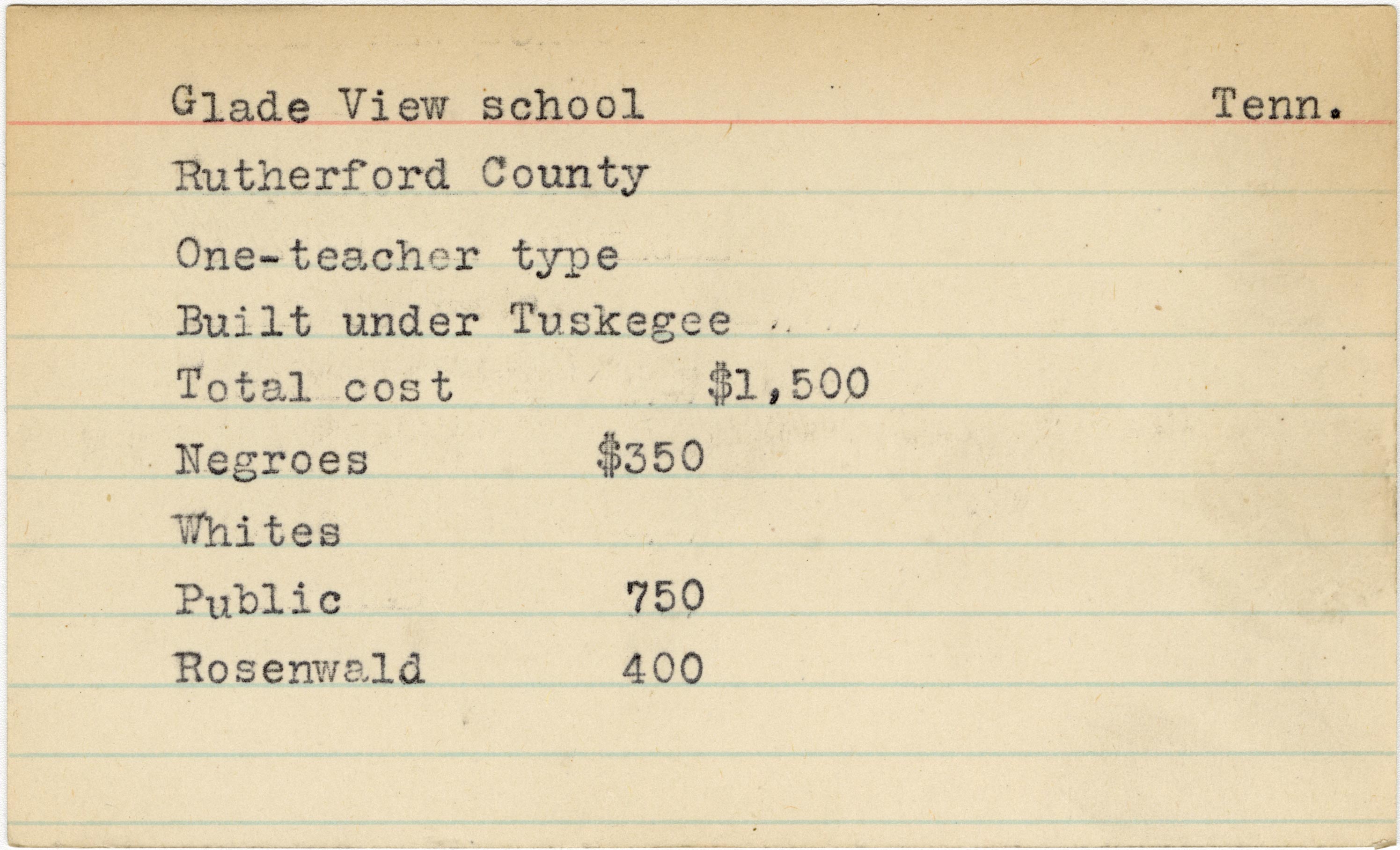 - School card from Rosenwald Fund for Glade View School in Rutherford County, Tennessee
